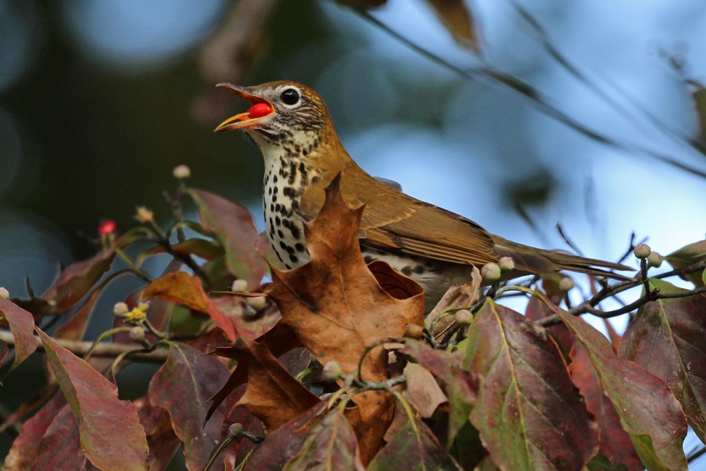 It was a handsome Wood Thrush who had stopped by to sample some of the bright red berries.