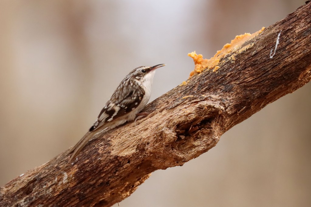 But in reality, those words are so true of the Brown Creeper that has become enamored with my backyard supply of Bark Butter. This little fellow is pretty much a constant fixture these days!