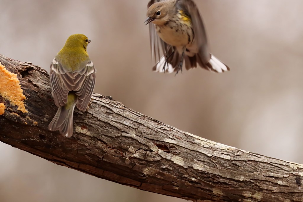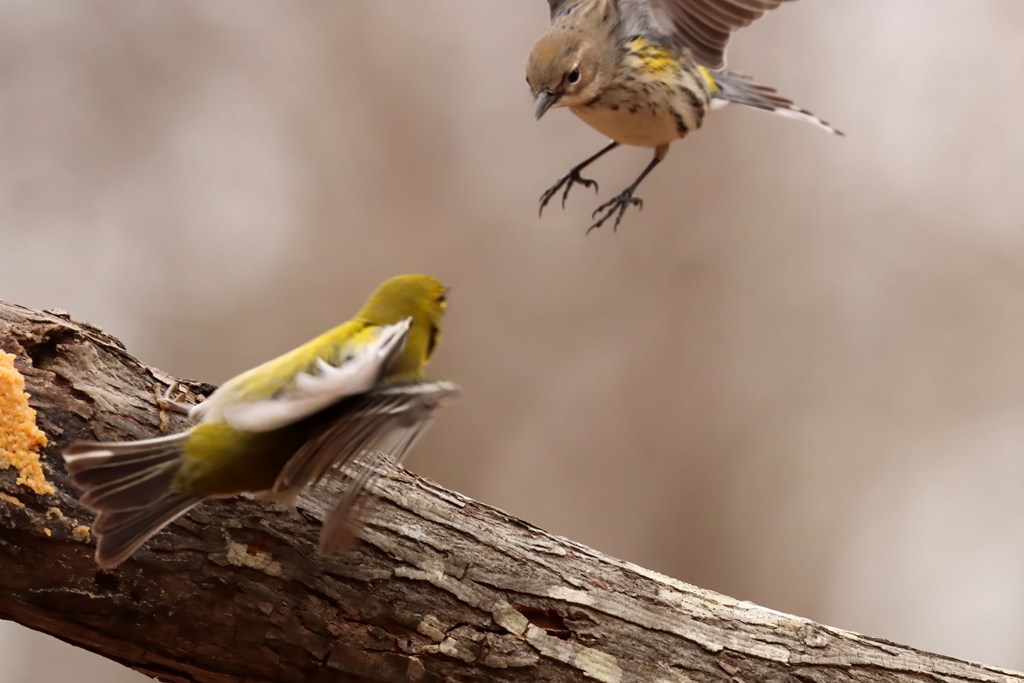 I wish I could say that everyone gave these buttery beauties the same warm welcome that I did, but it was not the case. The Pine Warblers were not amused! In fact, they seemed to call a temporary truce on their squabbling with one another so they could wage war on the newcomer. Below are a couple of blurry battle photos! Although it might appear otherwise, the Yellow-rumped was jumping up backwards out of the way.