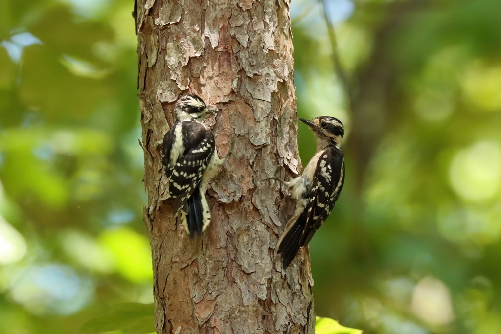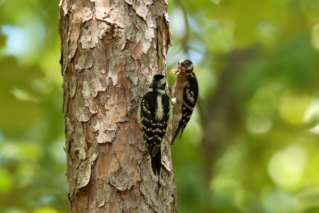 This young Downy (on the left) and her Mama wasted no time in coming for food, first eating at the tree trunk…