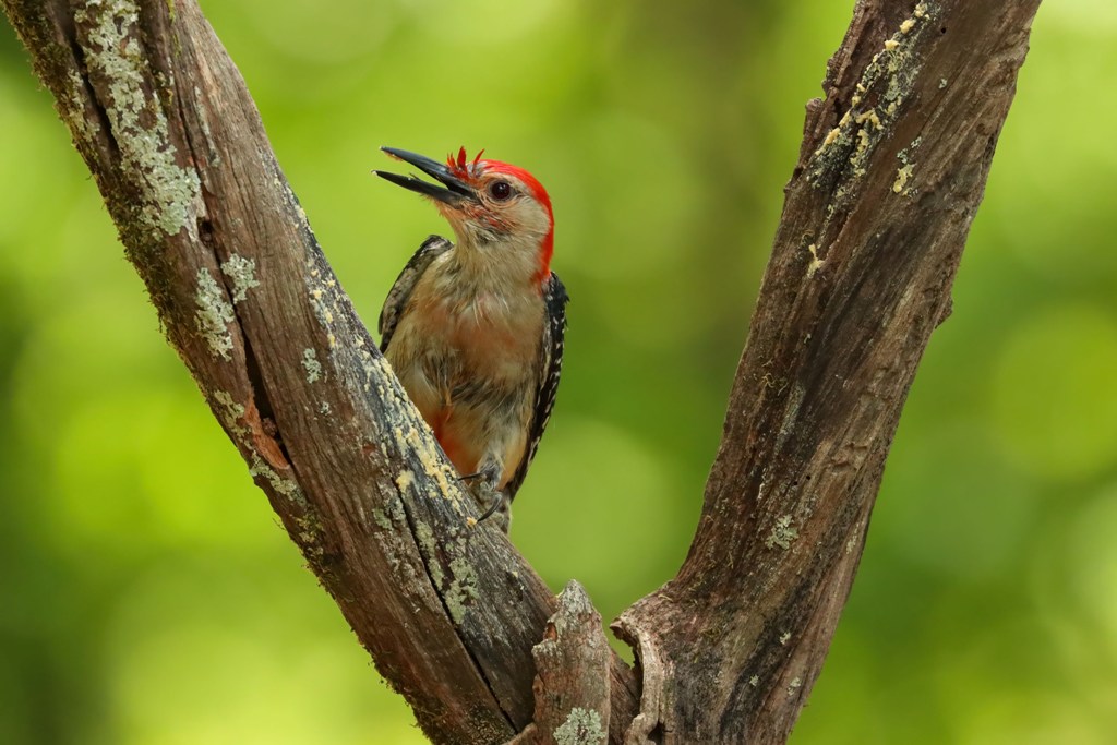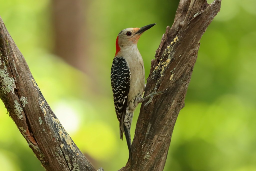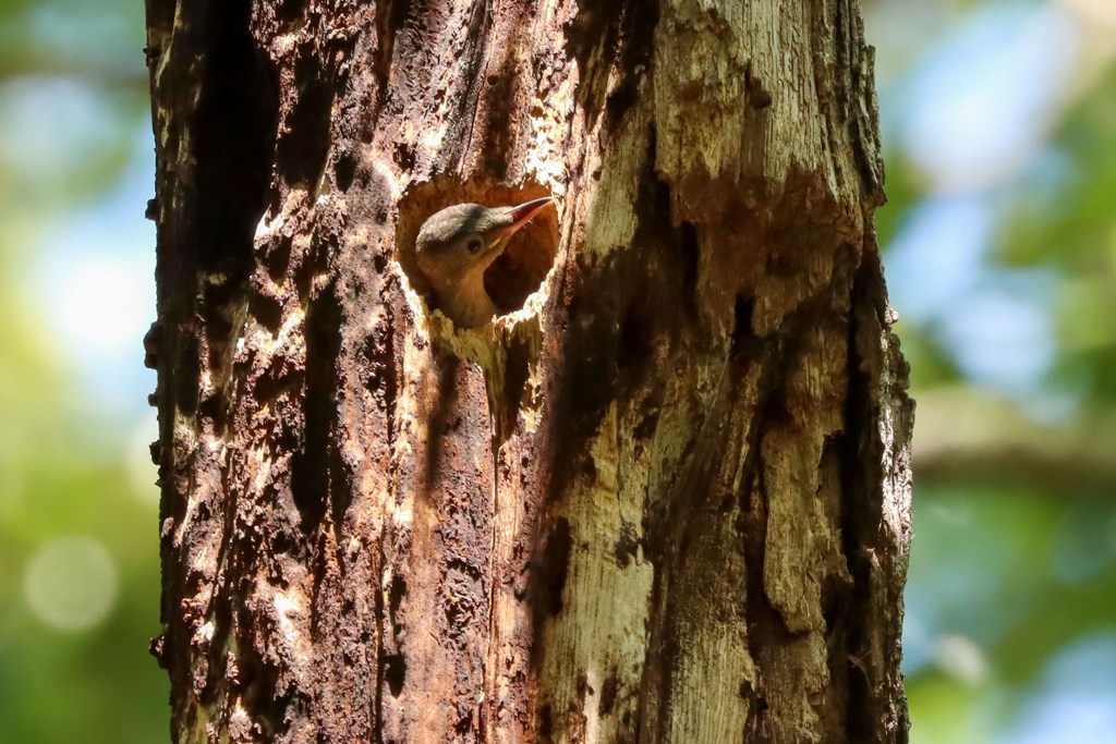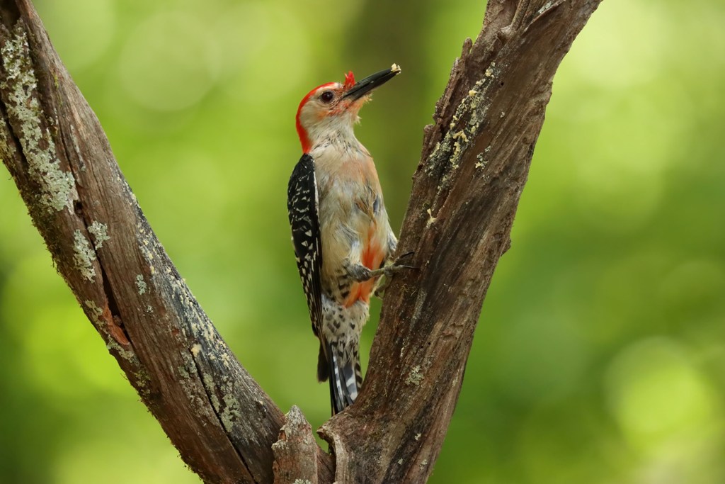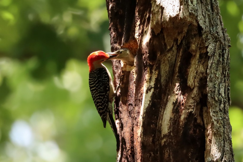 The Red-bellied Woodpeckers were still keeping their kiddos safely tucked away in the nest cavity, making trip after trip to feed them. Mama came first…
