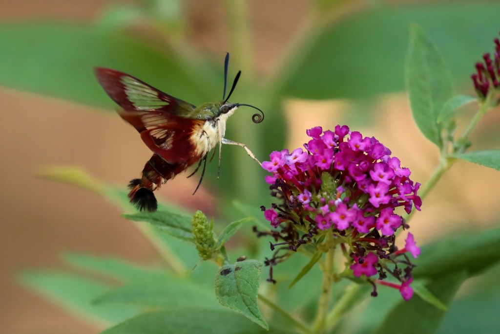 I was doing a backyard walk-about with the dogs this afternoon, and as the two mutts leisurely meandered (eating all kinds of things they shouldn’t) I stopped to dead-head one of the butterfly bushes. As I was about to pinch off a dead blossom, I was pleasantly surprised to find a Hummingbird Moth enjoying a bit of nectar.