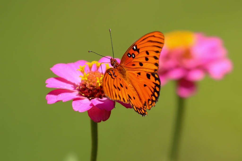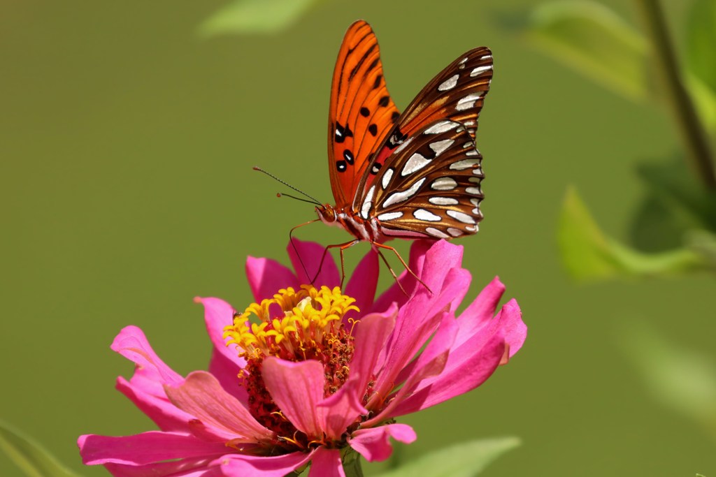 …this crazy-cool Gulf Fritillary, who was also enjoying said Zinnias…