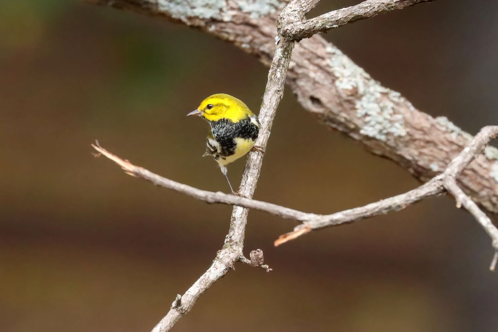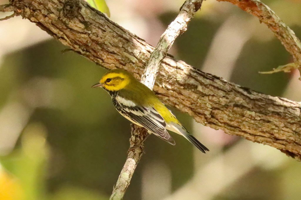 Turns out he is a Black-throated Green Warbler (id courtesy of the “Picture Bird” app) who proved to be a bit tricky to get a picture of because he flitted about up in the Oak leaves, where he blended right in. I had to wait for those moments when he came out into the clearing for a second…