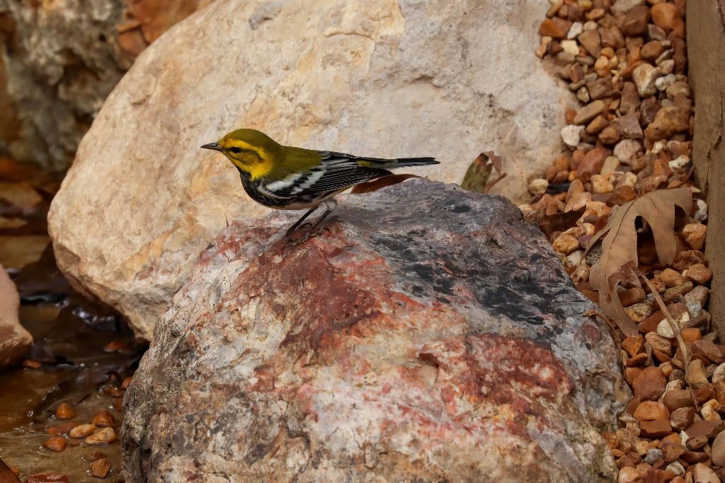 Turns out he is a Black-throated Green Warbler (id courtesy of the “Picture Bird” app) who proved to be a bit tricky to get a picture of because he flitted about up in the Oak leaves, where he blended right in. I had to wait for those moments when he came out into the clearing for a second…