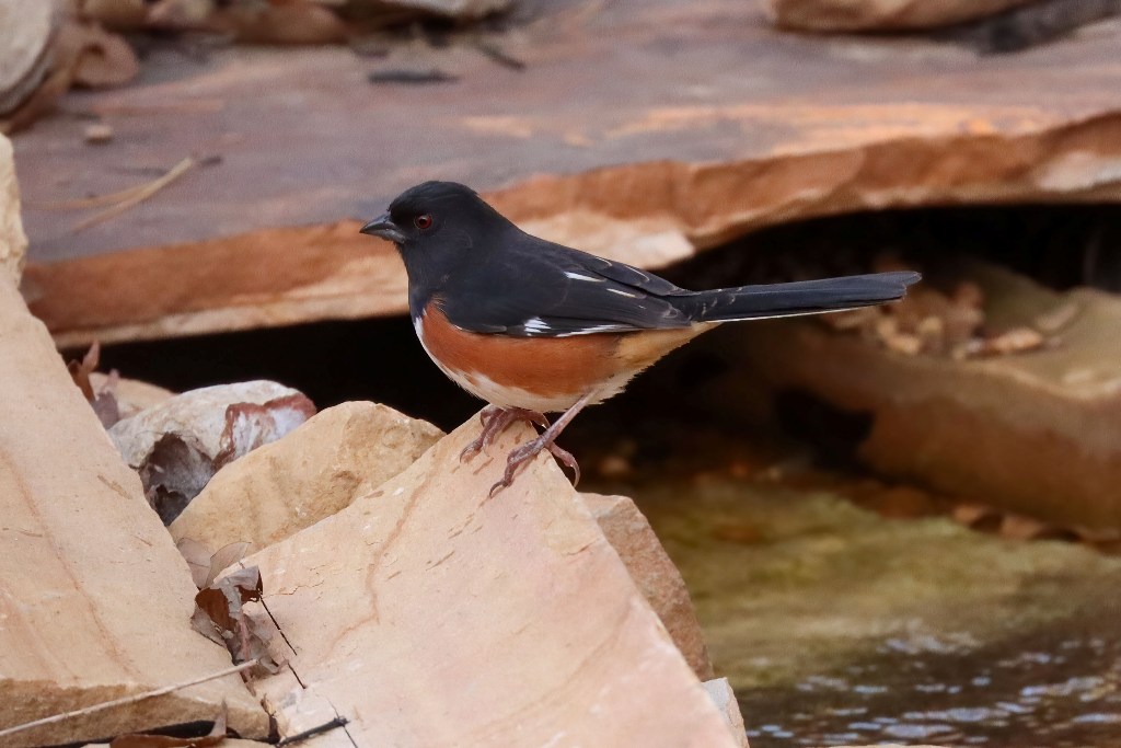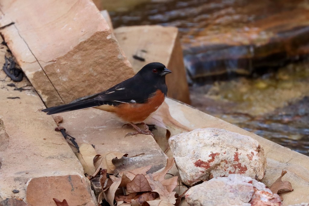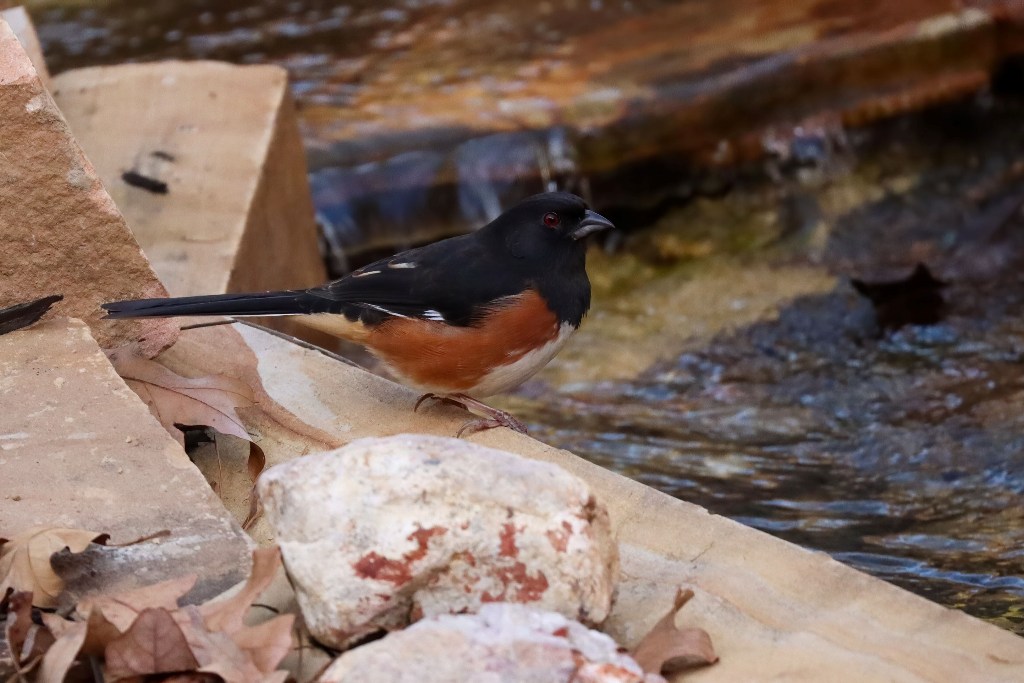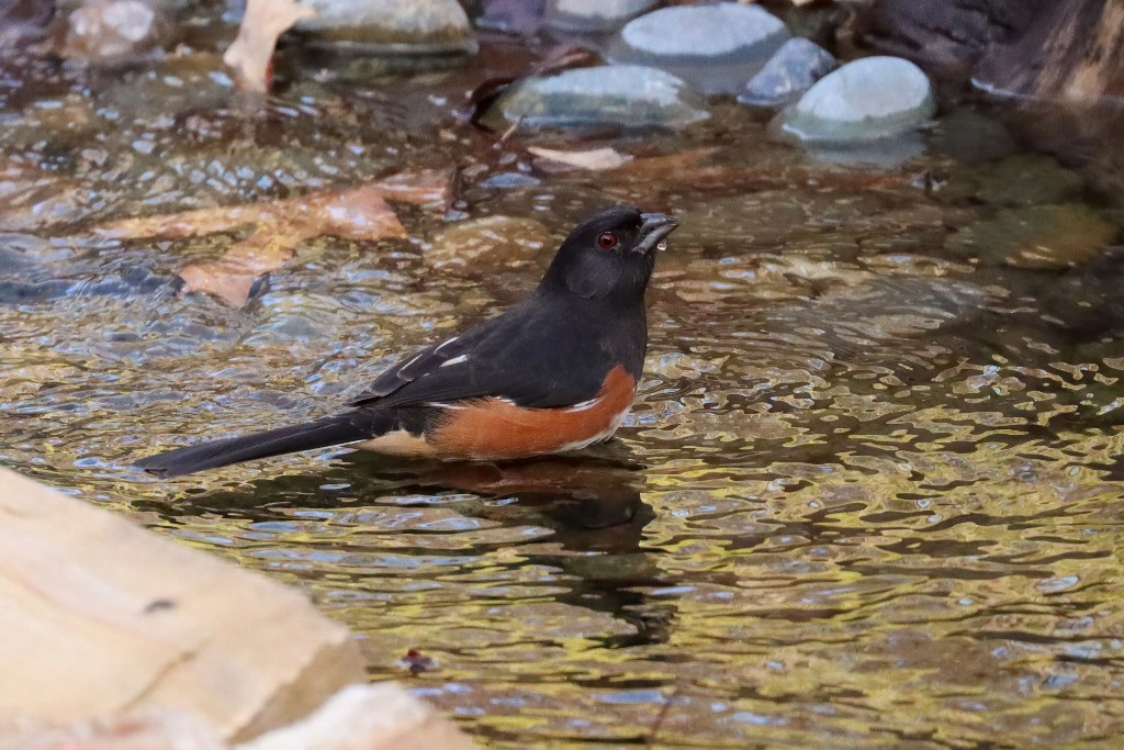 Yesterday afternoon, an Eastern Towhee paid a surprise visit to the backyard waterfall. This bird is one of my favorite infrequent visitors!