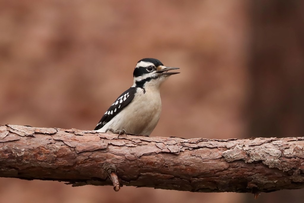 From a distance, this bird looks a lot like it’s lesser sized relative, the Downy Woodpecker, but Hairy’s have bigger bodies and longer beaks. Below is a picture of a male Downy that dropped in a few moments later so you can see how similar they look.