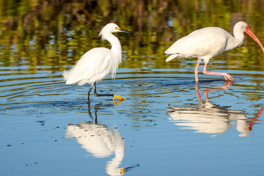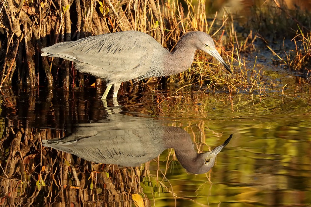 Our first morning there, I was taking pictures of some birds (like the Little Blue Heron and the Great Egret below) that were breakfasting in an area where the early sun was creating some nice reflections…