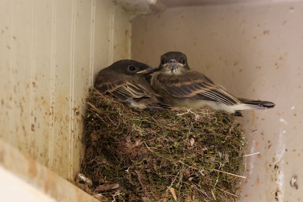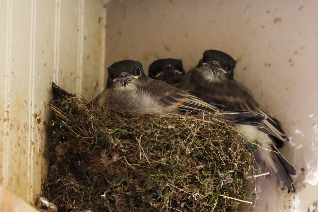 A pair of Phoebes and their brood of babies have made a magnificent mess of my front porch! I use the word “mess” because they have (for the second year in a row) built a nest in the corner of my front porch overhang, which means that the area gets decorated with their debris and droppings. But I use the word “magnificent” because, well, the word is fitting – they are indeed magnificent!