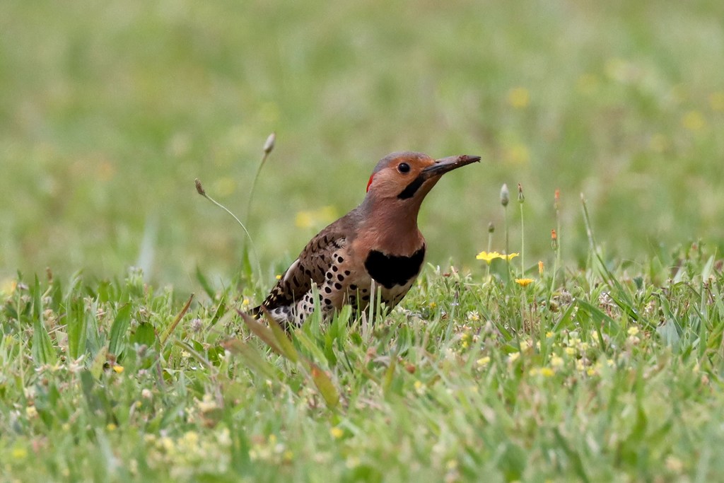 …and a Northern Flicker happily foraging in the field, his beak dirty from his bug hunting efforts. You can tell its a male by the striking mustache.