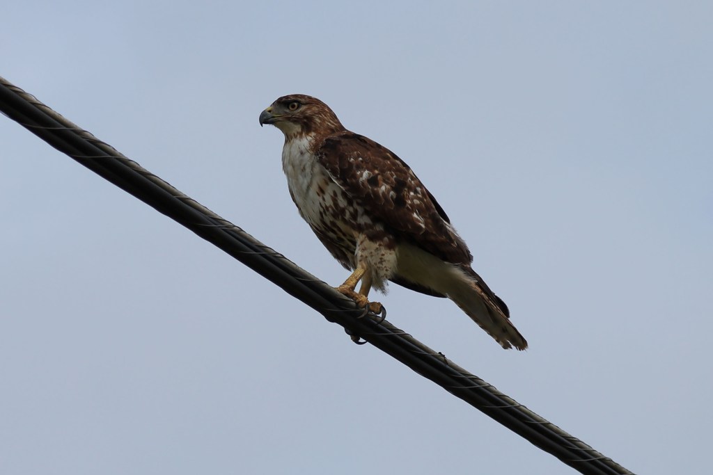 Our first encounter was with a Red-tailed Hawk who came screeching toward us as soon as we had gotten out of the Jeep. I was still getting my camera gear situated when he came flying straight toward my head with a half dozen Blackbirds in hot pursuit. At the last second, he veered upward and landed on an overhead wire where he could defend himself a little better. I normally see Red-shouldered Hawks in my yard, so seeing him was a delightful way to start the day.