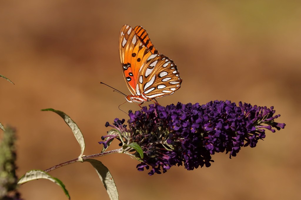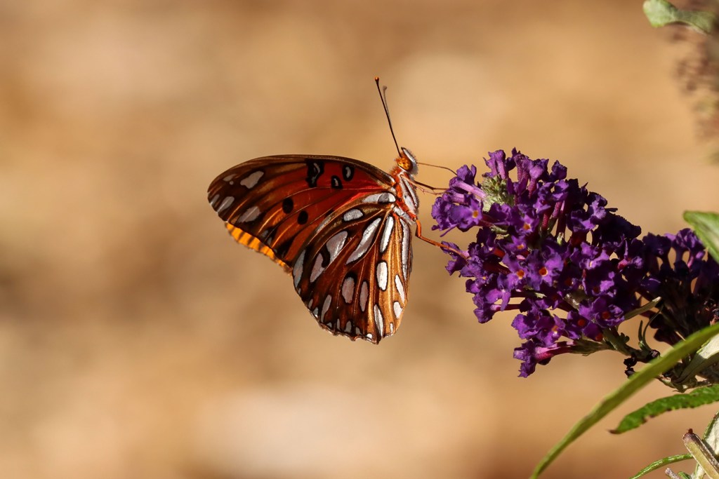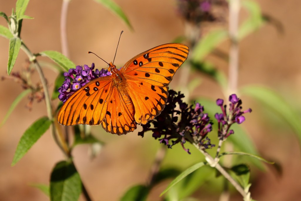Well, as is his habit, hubby came to the rescue and remedied the situation by making a quick trip to Pike Nursery where he picked up two butterfly bushes with deep purple blossoms. He planted them, watered them, and in less than an hour this beautiful Gulf Fritillary was enjoying them.