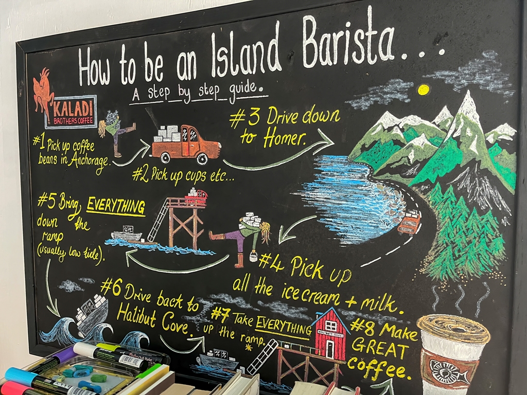 We had to laugh at the illustration showing the process it takes to keep the coffee flowing at Halibut Cove! Not quite as simple as working at Starbucks!