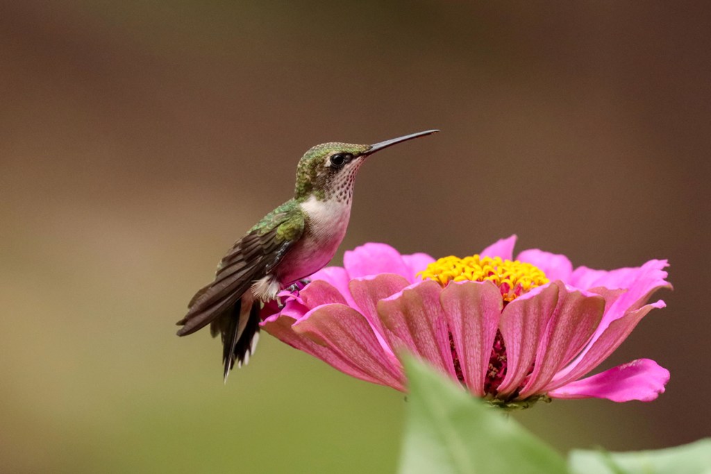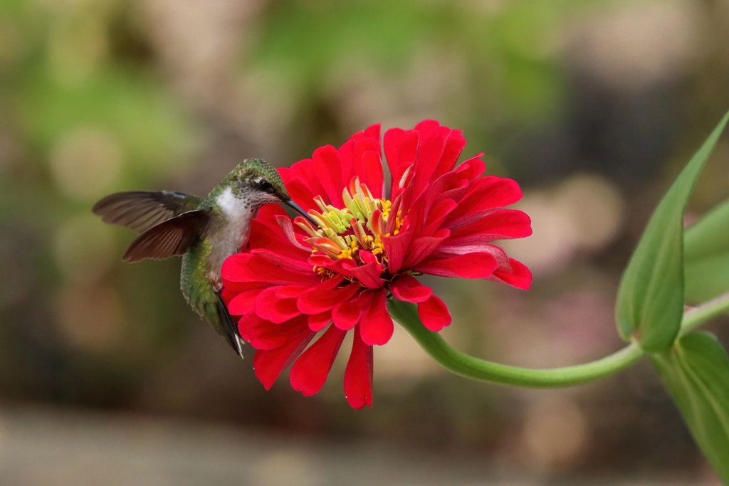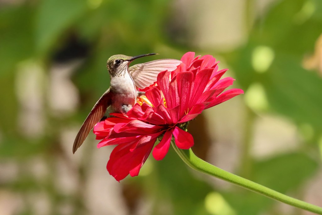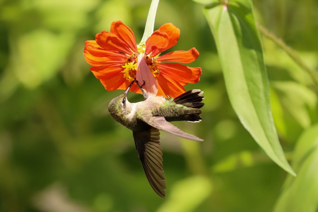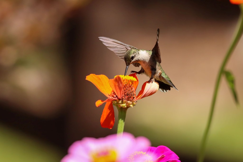 A young Ruby-throated Hummingbird paid a visit to the Zinnias, but instead of his typical darting in and dashing off, he was intent on sticking around to gather as much nectar as his tiny tummy could hold. He ate from the orange flowers..