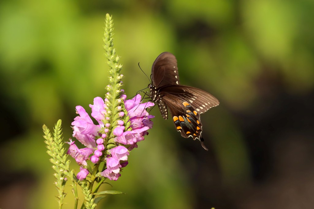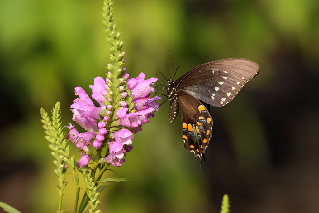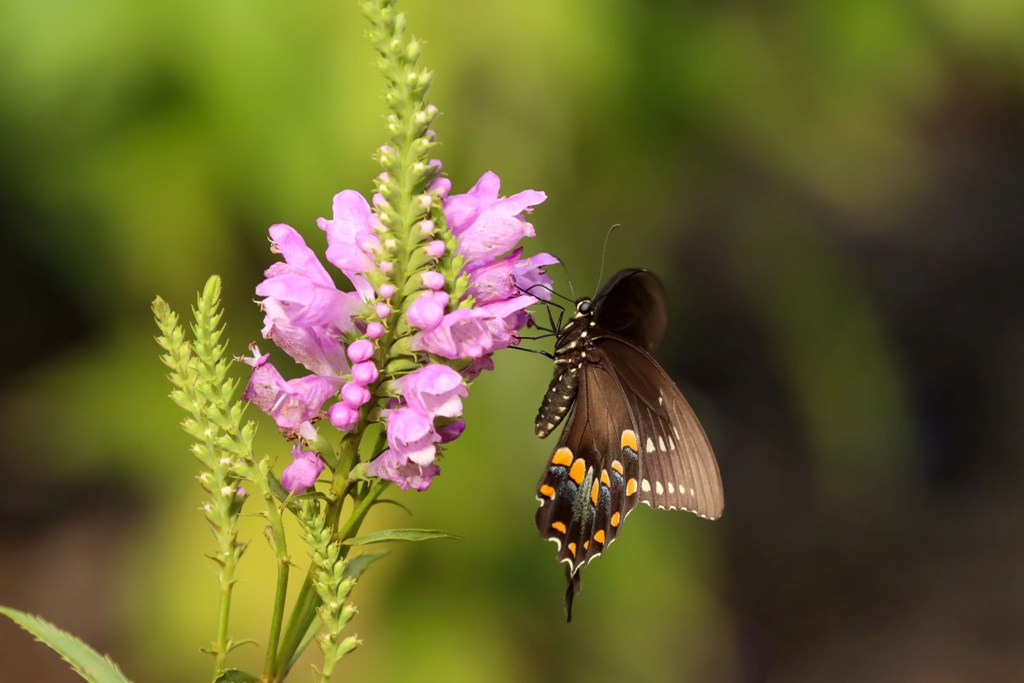 The front yard Zinnias continue to be a hugely popular place, but the backyard has blossoms too – like this beautiful Obedient Plant which recently started blooming. The Swallowtails (like the Spicebush below) absolutely love it!