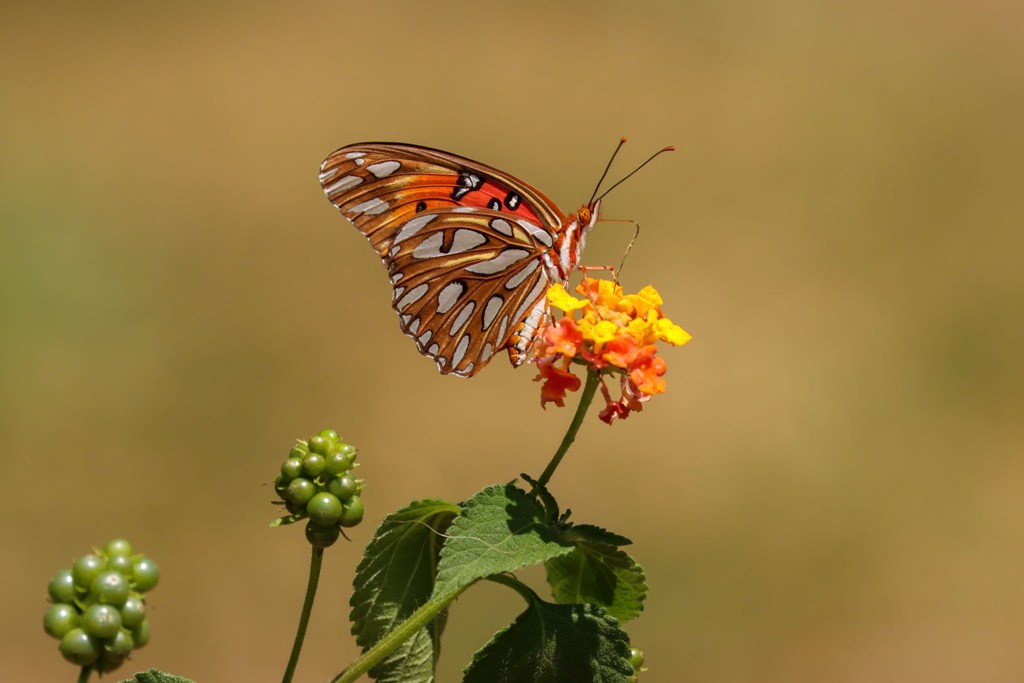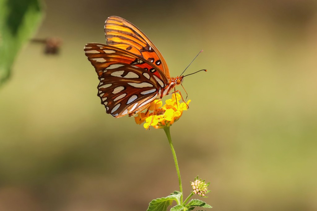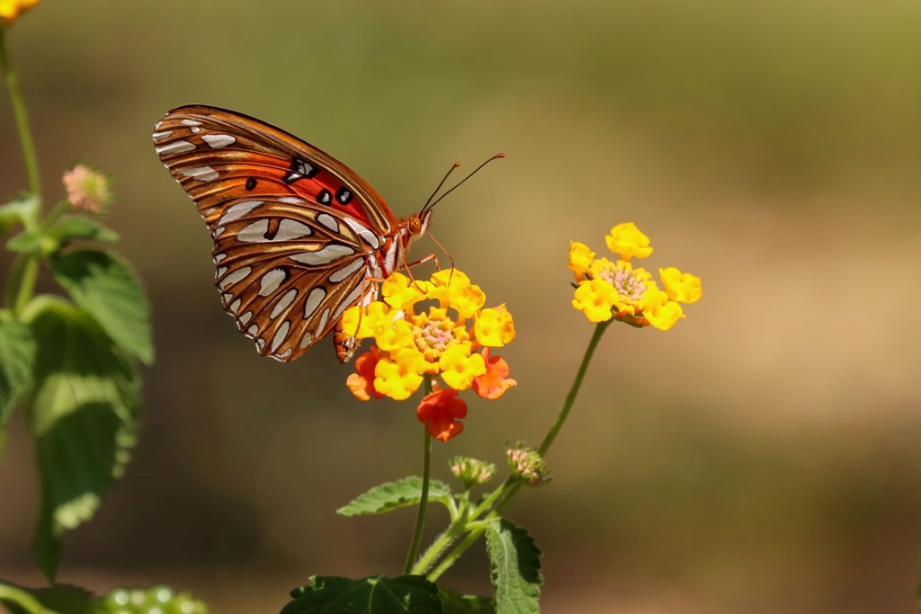 The zinnias are still quite the hot spot (literally, since it’s been in the mid 90’s everyday!), but there is at least one butterfly that has been loving the lantana lately – the Gulf Fritillary.