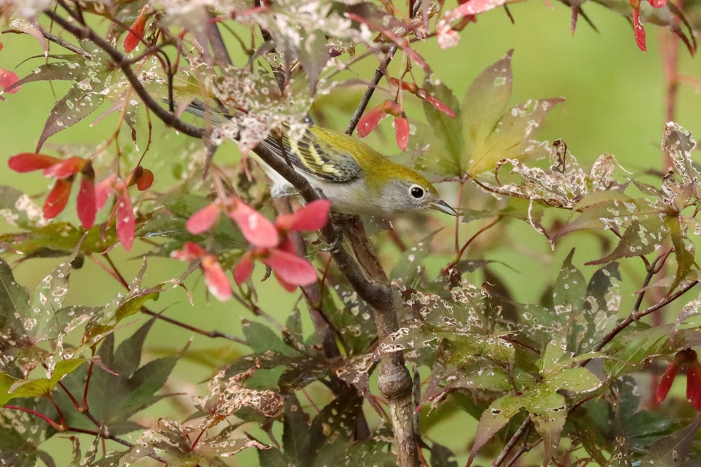 This Chestnut-sided Warbler was darting in and out of the Japanese Maple tree, which kept him mostly camouflaged.
