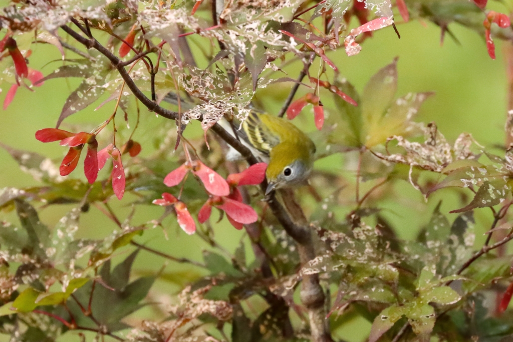 This Chestnut-sided Warbler was darting in and out of the Japanese Maple tree, which kept him mostly camouflaged.