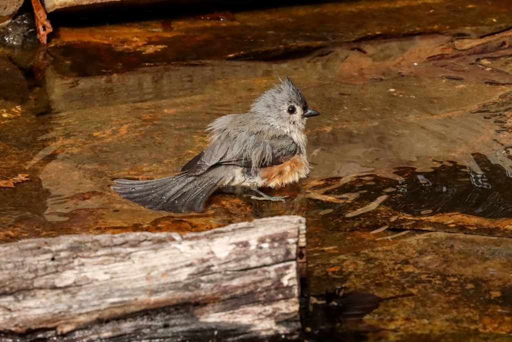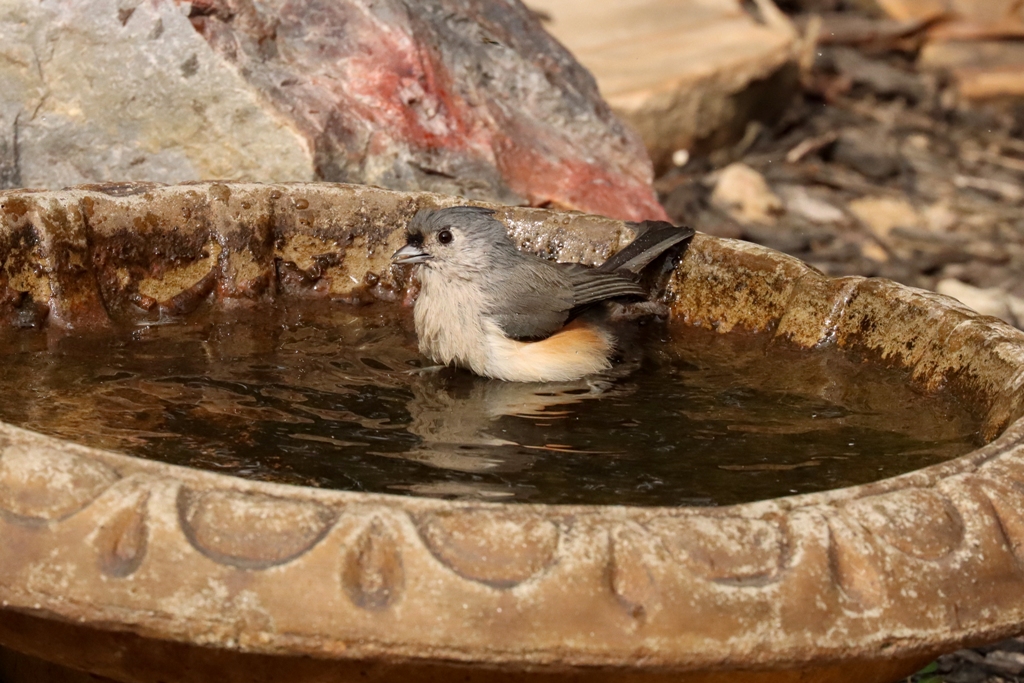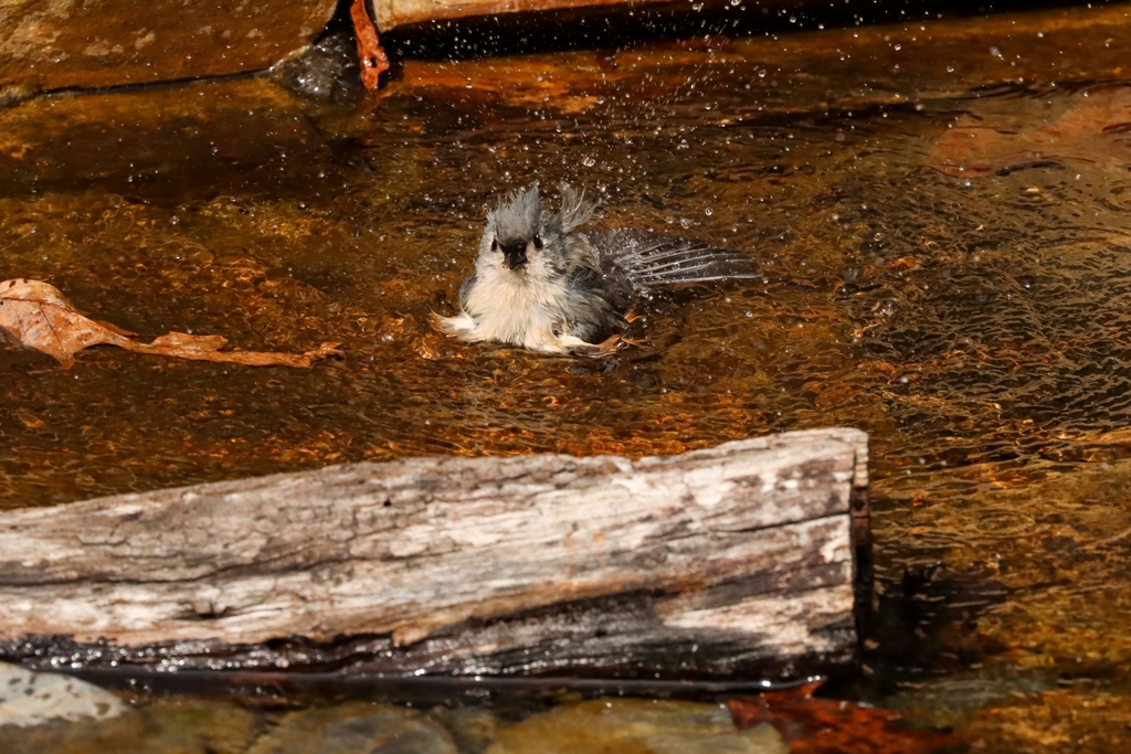 So, first to be featured in the “Bathing Bonanza” series is the Tufted Titmouse. We have tons of these little cuties flitting about right now, and as soon as one makes a beeline for the fountain, the others do too.