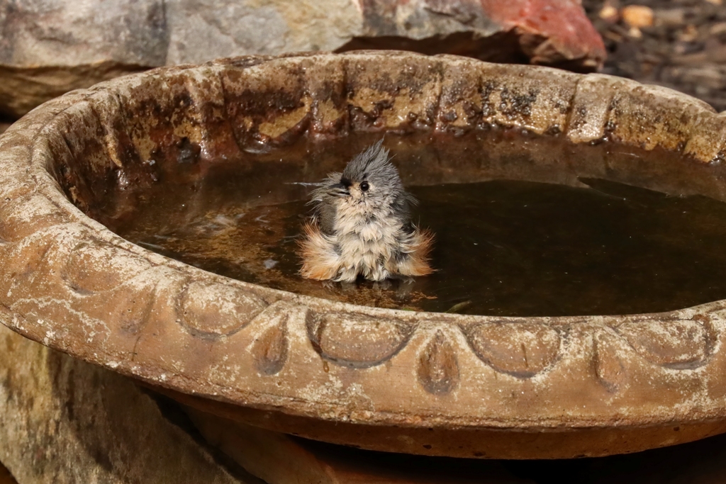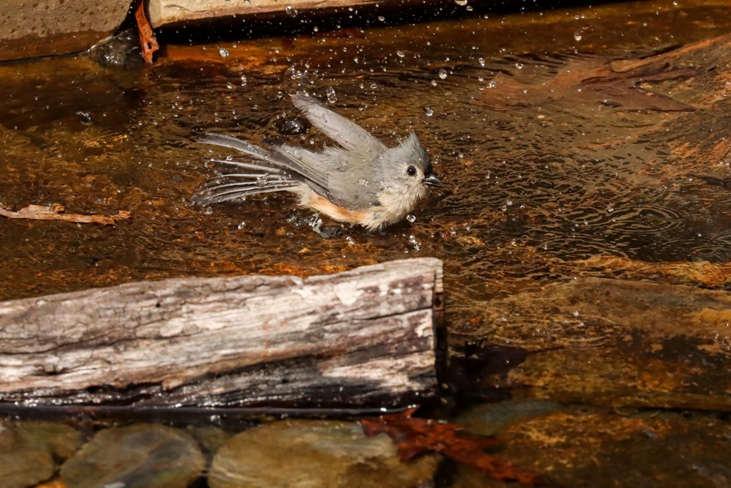 So, first to be featured in the “Bathing Bonanza” series is the Tufted Titmouse. We have tons of these little cuties flitting about right now, and as soon as one makes a beeline for the fountain, the others do too.