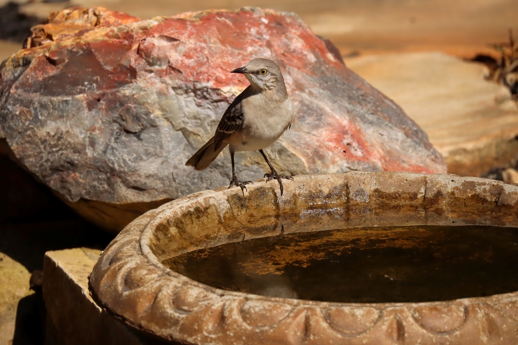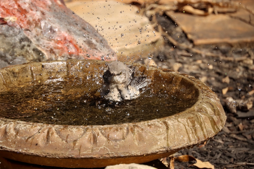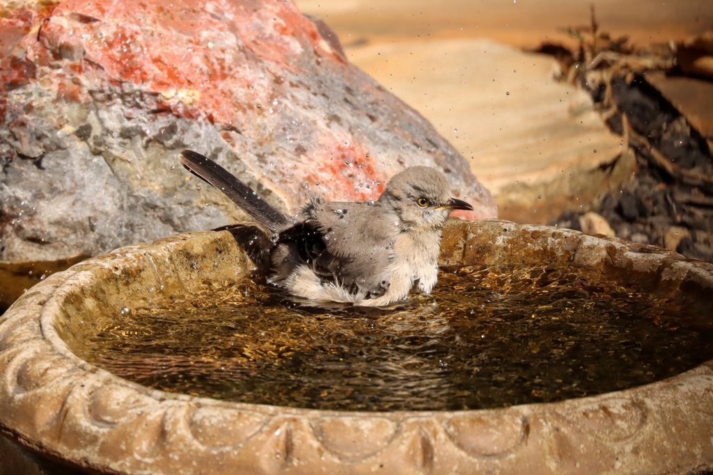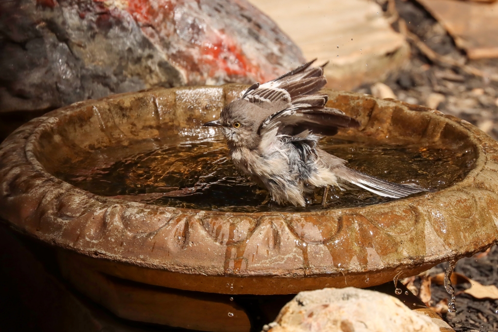 Next on the list of backyard bathers is the Northern Mockingbird. I learned (courtesy of Google) that this bird’s Latin name means “many-tongued mimic” – which is fitting since he imitates the songs and calls of other birds, and of frogs and toads too! I’m thinking his mimicking might extend to other bird’s actions as well since once he saw some Titmice splashing about he had to follow suit!