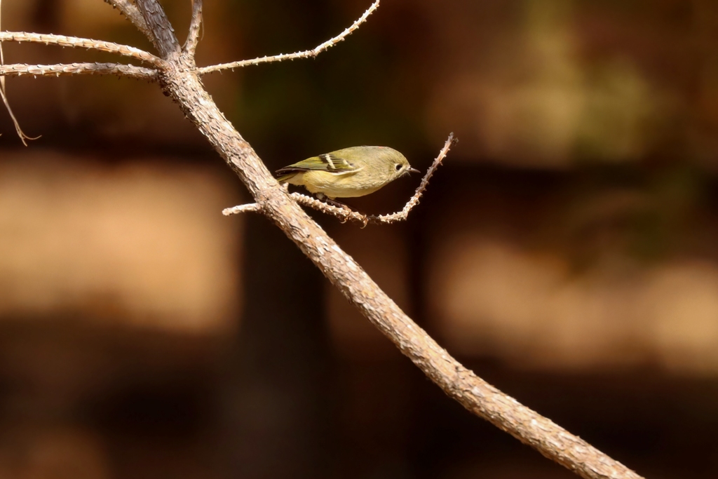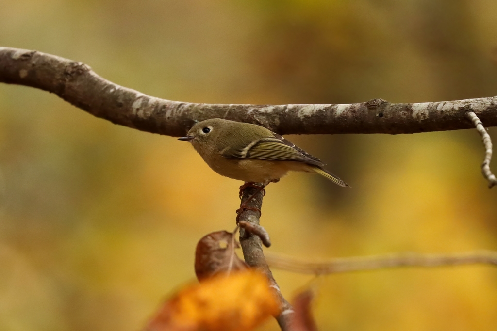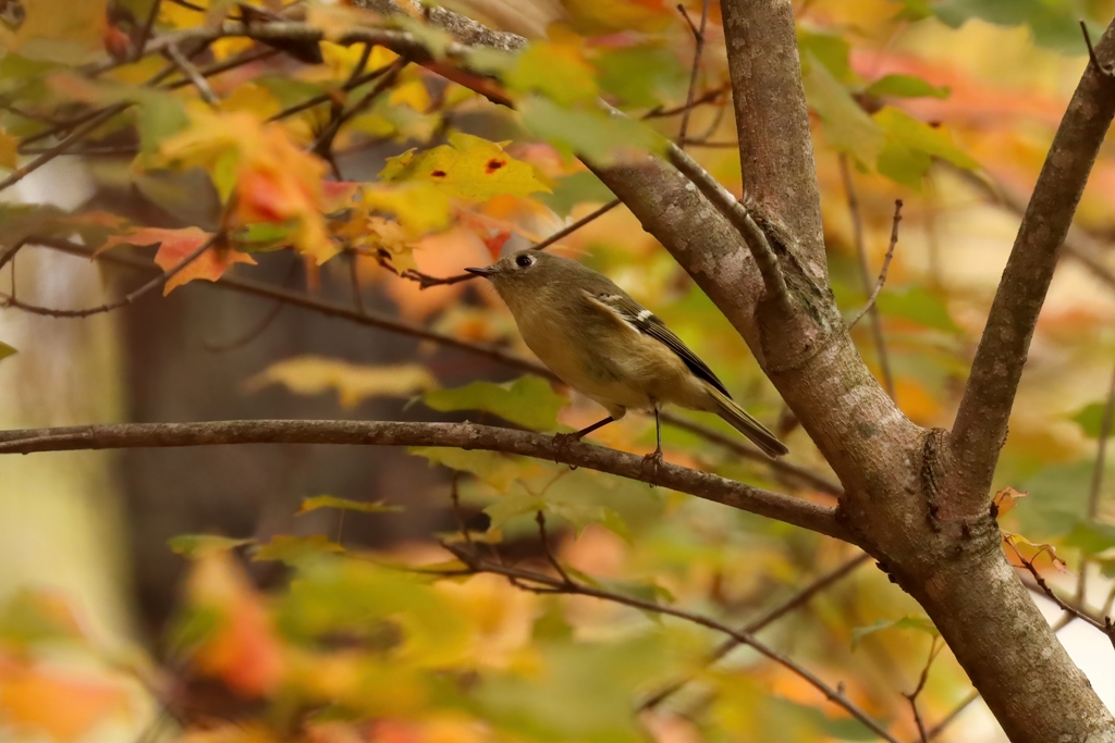 I saw the Ruby-crowned Kinglet first, darting in and out of the leaves in the Maple tree.