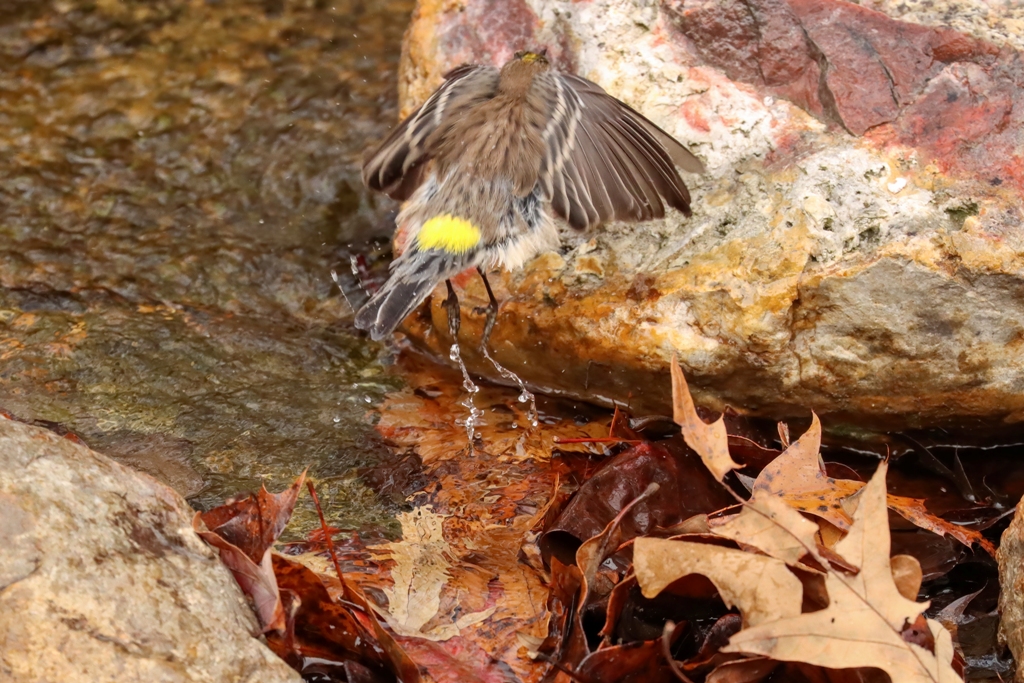 …and splashing about in the fountain. This one below had a quick dip and then flew away in a flash. Although I should I say he “flew away with a flash” since he gave us such a nice glimpse of his buttery behind!