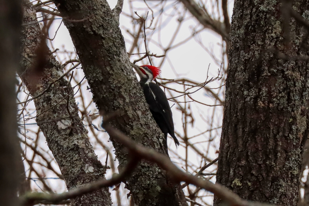 …and a Pileated Woodpecker has been flying about the outskirts of the yard taunting me with his loud laugh-like cry. He was quite a distance away and I had to shoot him through a tangle of branches, so until he decides to come closer and land in a clearer spot and strike a pretty pose, this picture will have to serve as proof that he’s actually hanging about!