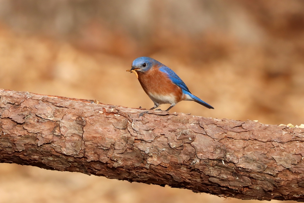 The other day, he and I traipsed out to the woods, and returned to the backyard with the straight trunk of a slender pine tree and some barren farkleberry branches. Hubby carved out the center of the pine trunk to turn it into a feeding trough, and strapped the farkleberry branches up to our big old oak tree by the fountain to give some extra perches and places to smear Bark Butter.