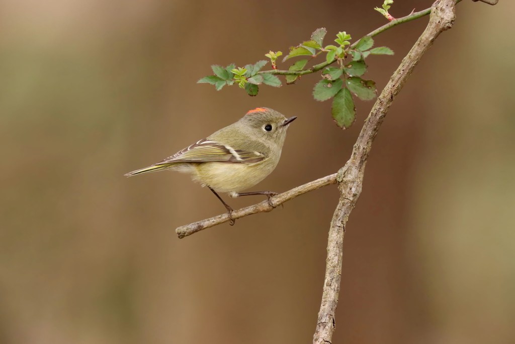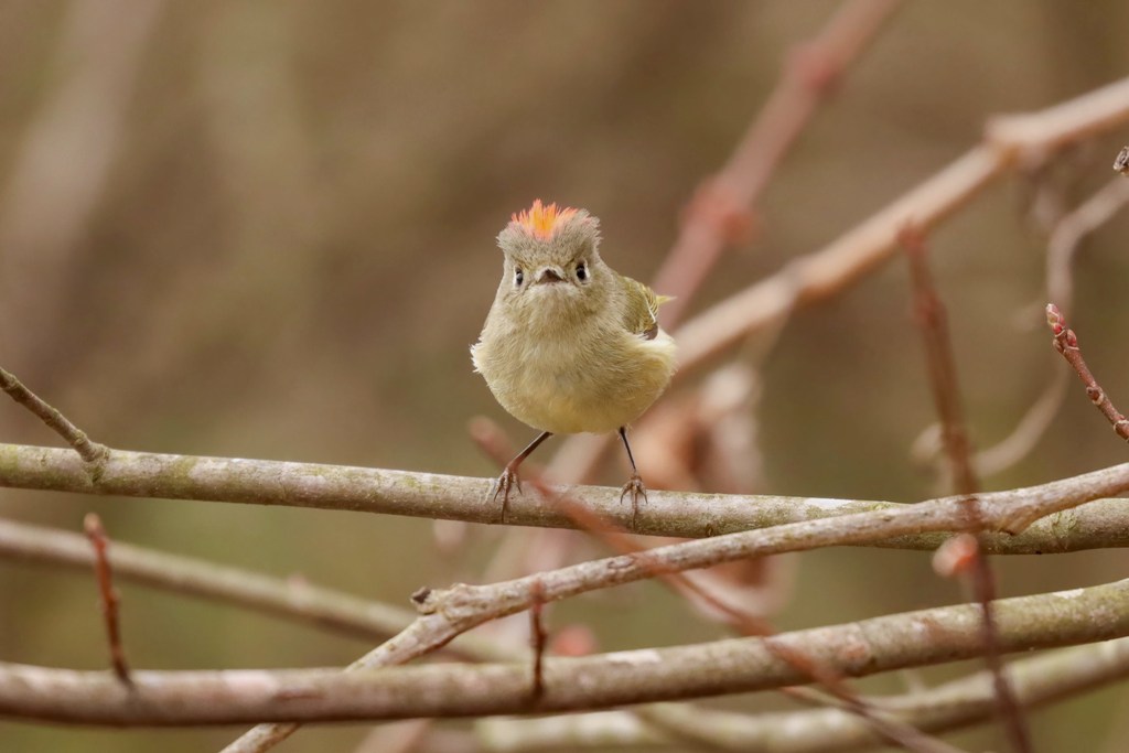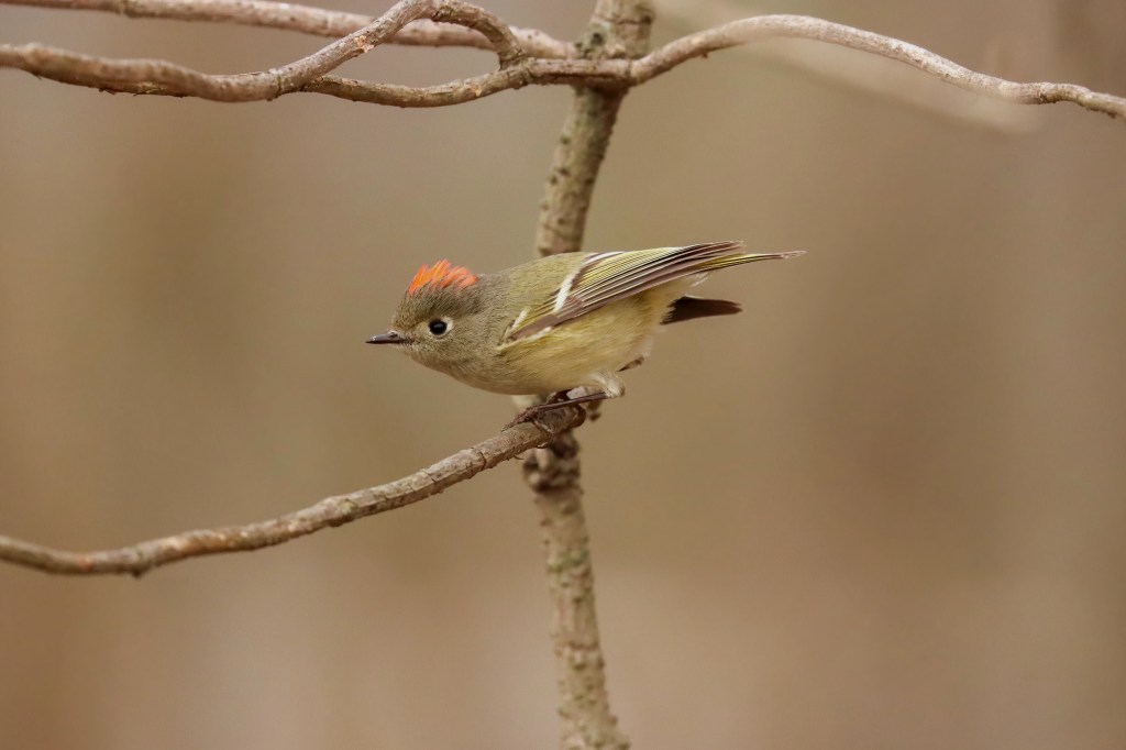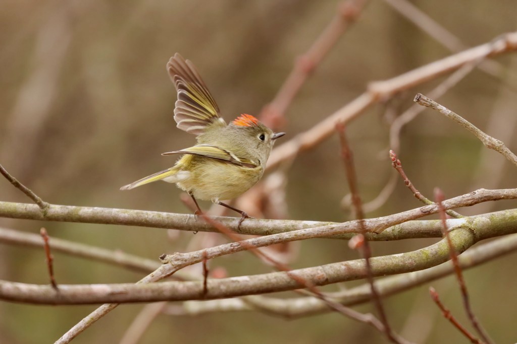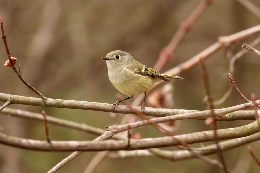 The geese were fun to watch, but my favorite photos of the day were of a Ruby-crowned Kinglet who was loudly chattering from some brambly branches. Normally, these little birds keep their crowns concealed, like this fella…