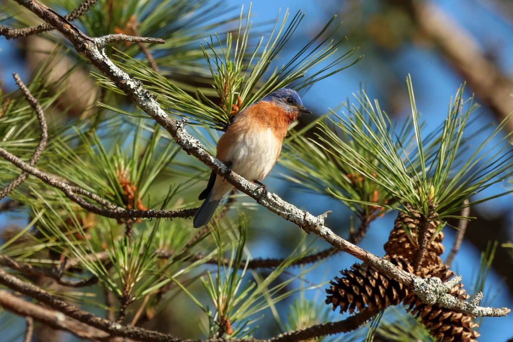 A bit farther down the path there was a lovely male Bluebird in the top branches of a pine tree.