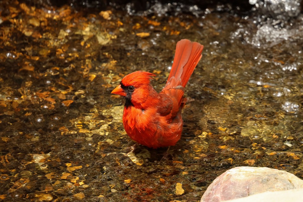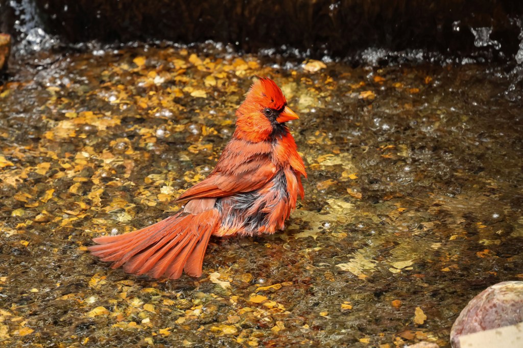 Well, every bird seems to have its own favorite part of the fountain, and for the Cardinals, it’s Amicalita. This gorgeous guy stopped in for a refreshing dip the other day.