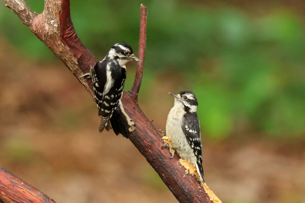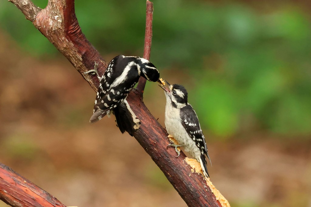 The latest batch of babies to arrive are some delightful Downy Woodpeckers. I have to laugh at this little gal, who is sitting in her food while Mama feeds her.