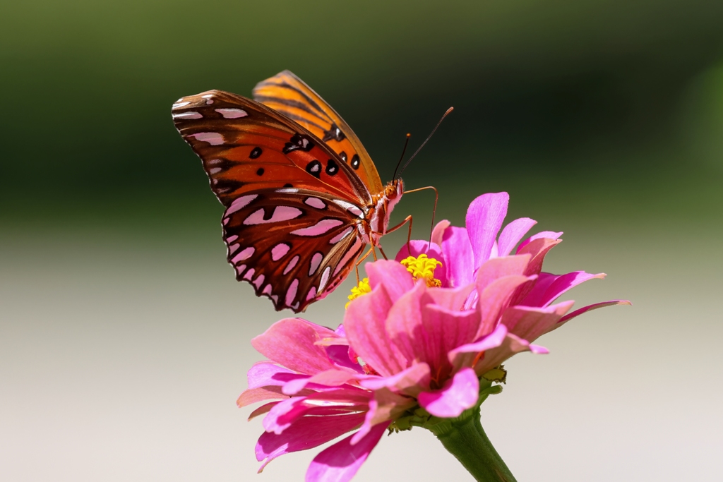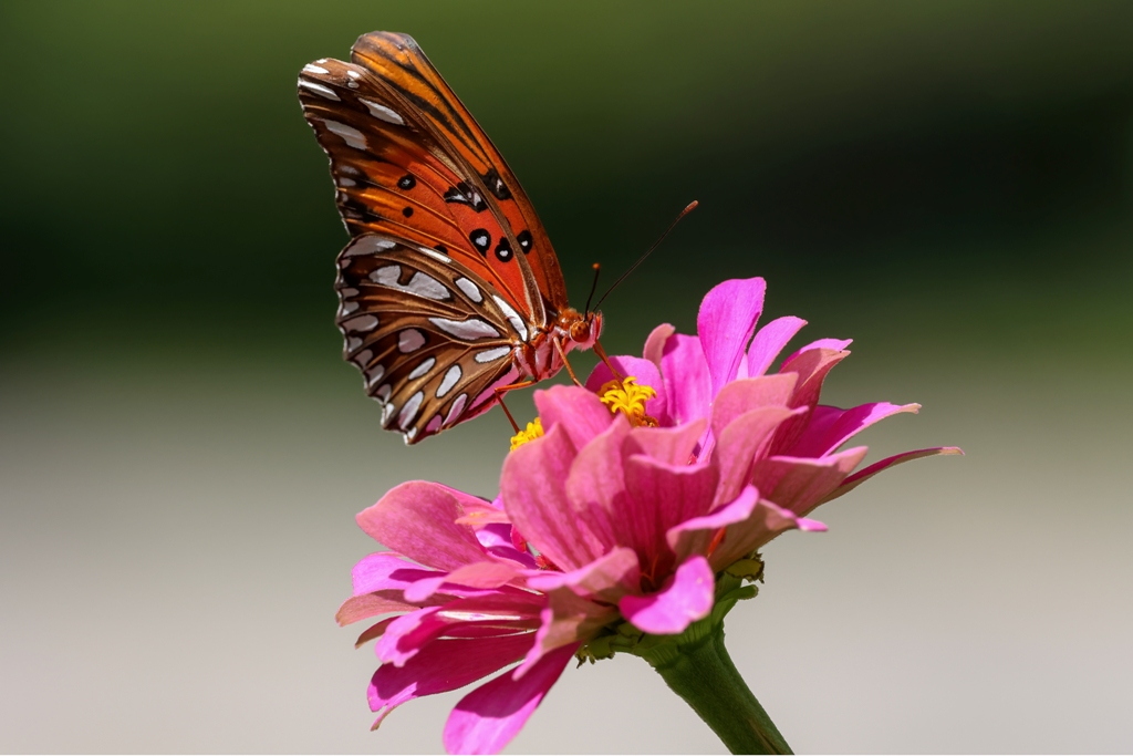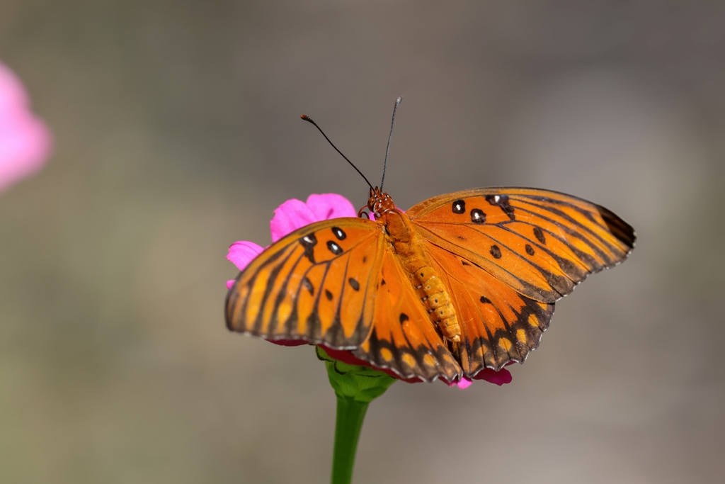 I walked outside with my camera today with the hopes of taking some more Hummingbird photos, but instead I was treated to a visit by another flower feaster – this lovely Gulf Fritillary.