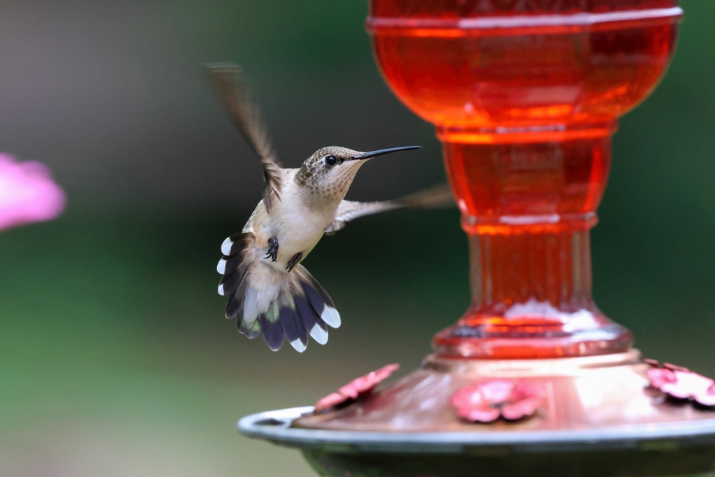 …always quick to go into combat mode. By the way, you can tell this is a female because she lacks the colorful throat band, and, her tail feathers (which you can see in the pictures above) are white-tipped and rounded instead of dark tipped and pointed.