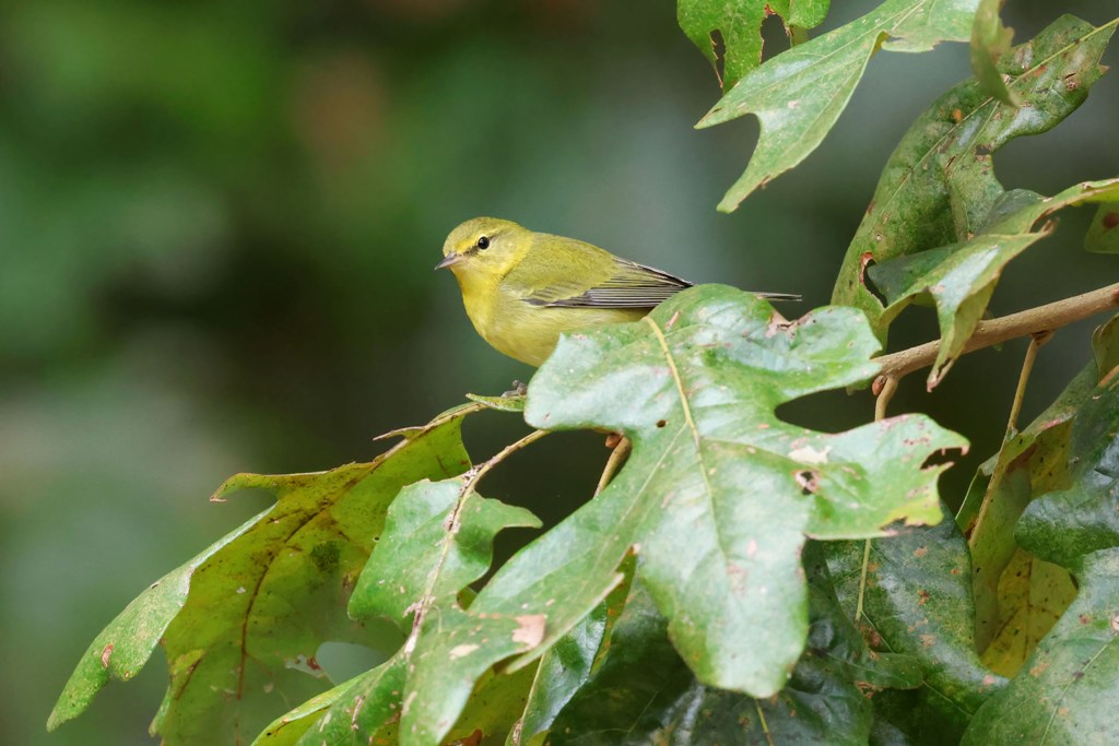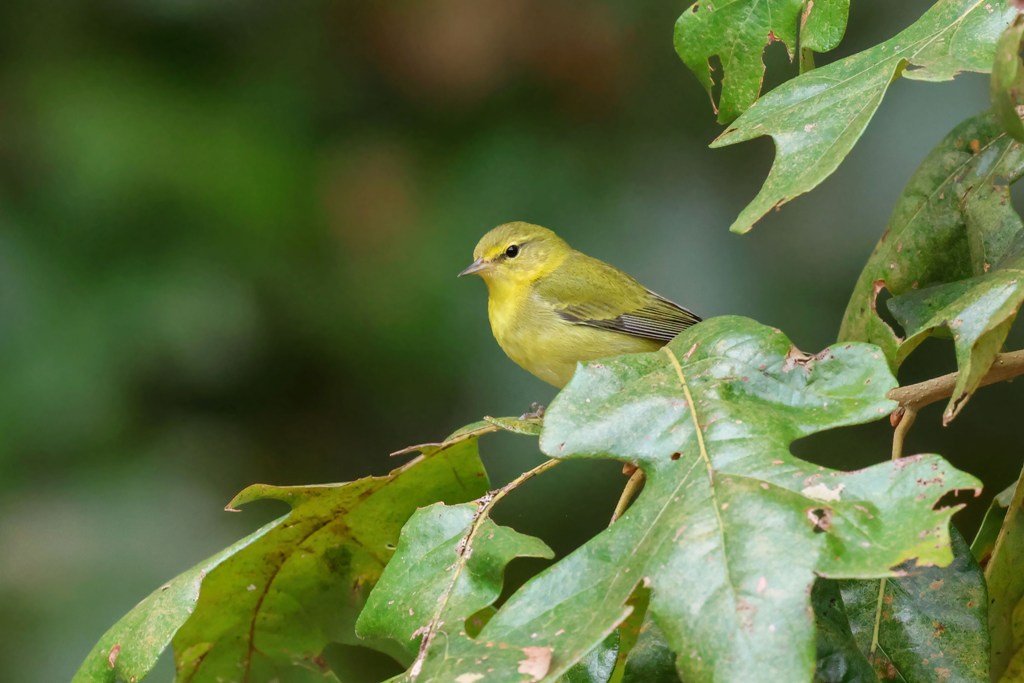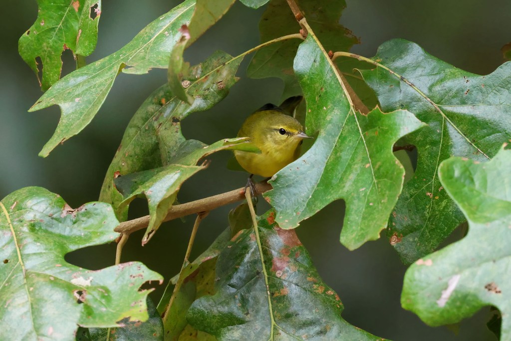 I was outside on the deck and happened to glance up and see some movement in the leaves of our backyard Post Oak. Then, this little Tennessee Warbler peaked out.