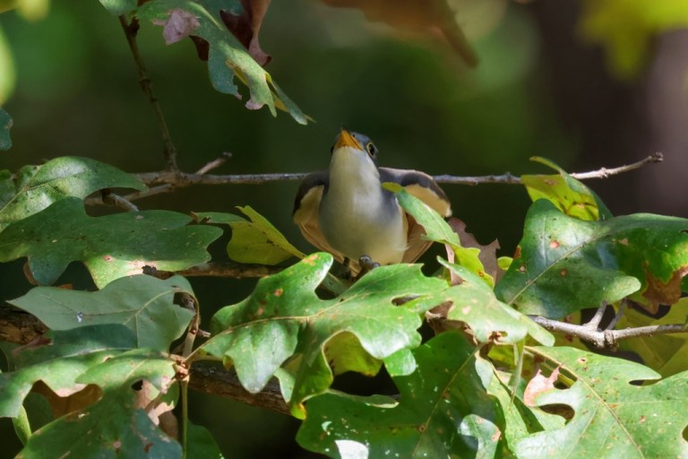I was sitting out on the back deck this past Sunday, watching my fantasy football team hand over a victory to my archrival (who happens to be my son-in-law!), when some movement up in the leaves of the post oak caught my attention.