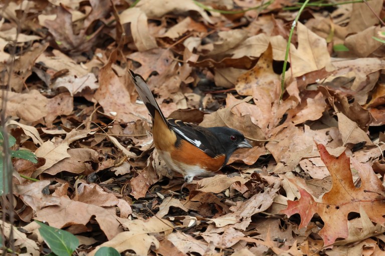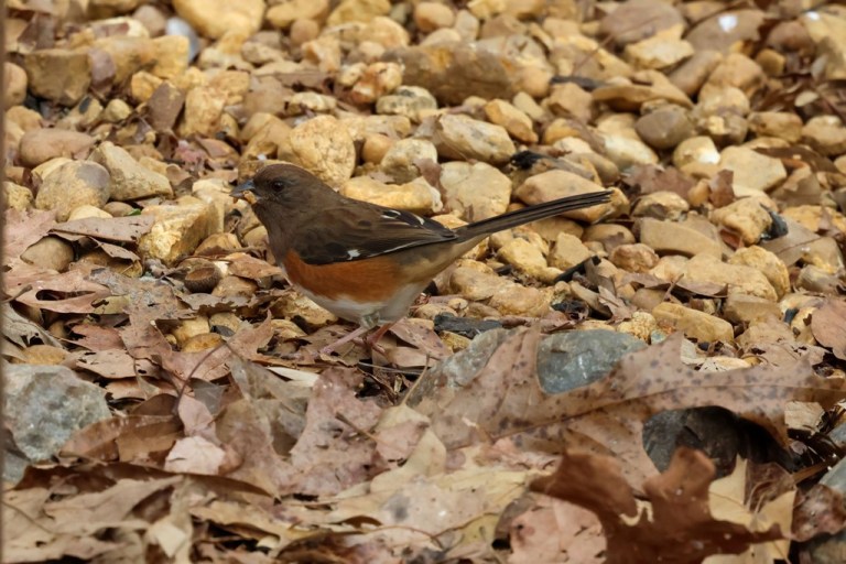 Eastern Towhees are beautiful birds that seem to love our front yard and our side yards, but have been difficult to lure into the backyard. I think there’s just too much of a crowd for their liking!
