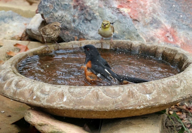 You clearly are a talented towhee caller! I love the expression on the finches waiting a turn at the birdbath. The almost look like they are frowning impatiently!