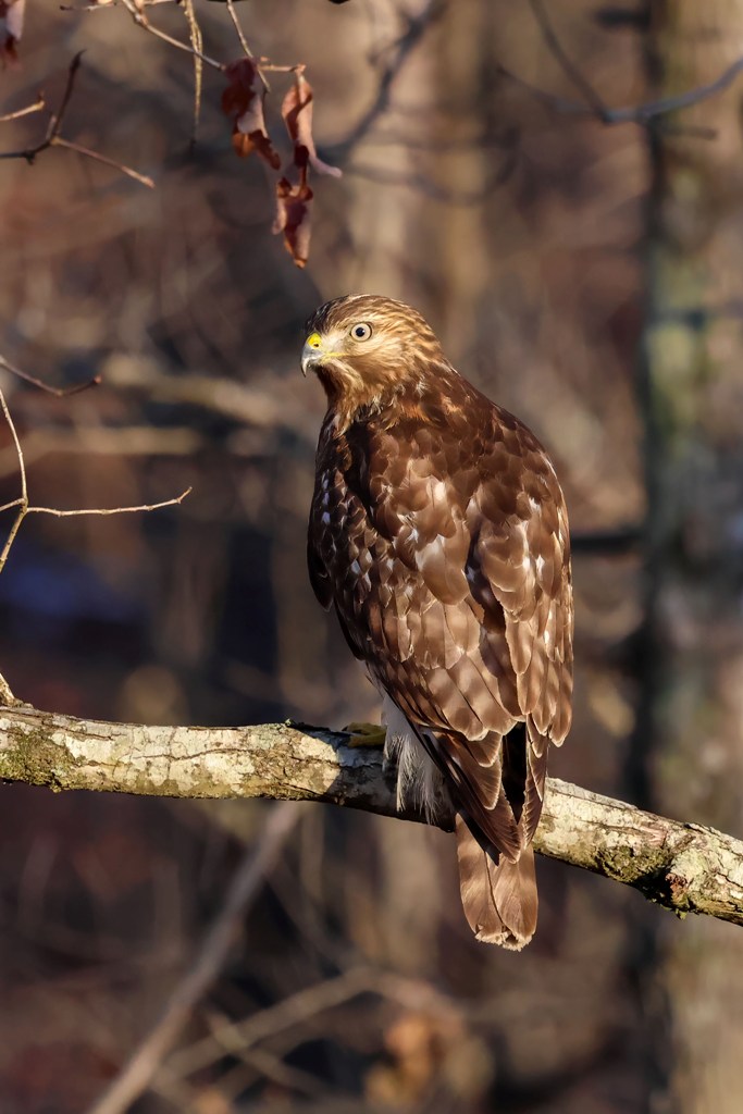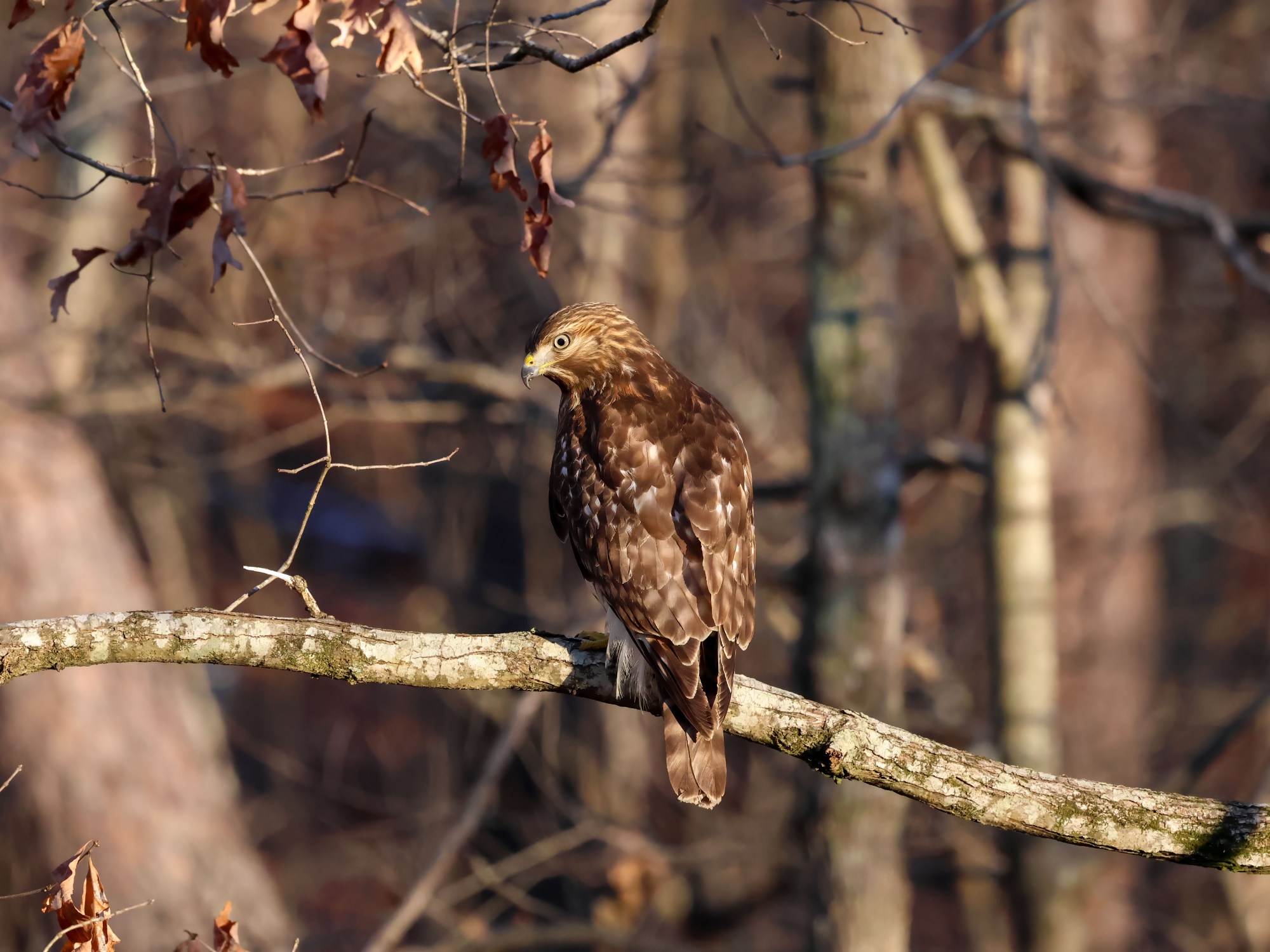 I glanced out the window the other day and saw a beautiful Red-shouldered Hawk perched on a backyard branch. I knew I wanted to try and get a picture, so I grabbed my camera (while hubby distracted the dogs) and I slowly opened the back door, trying really hard not to make any noise or sudden movements.
