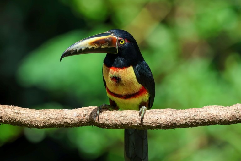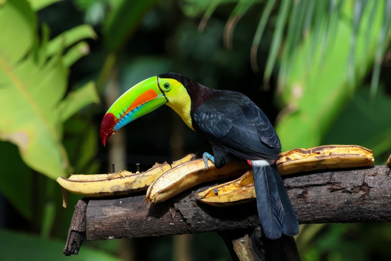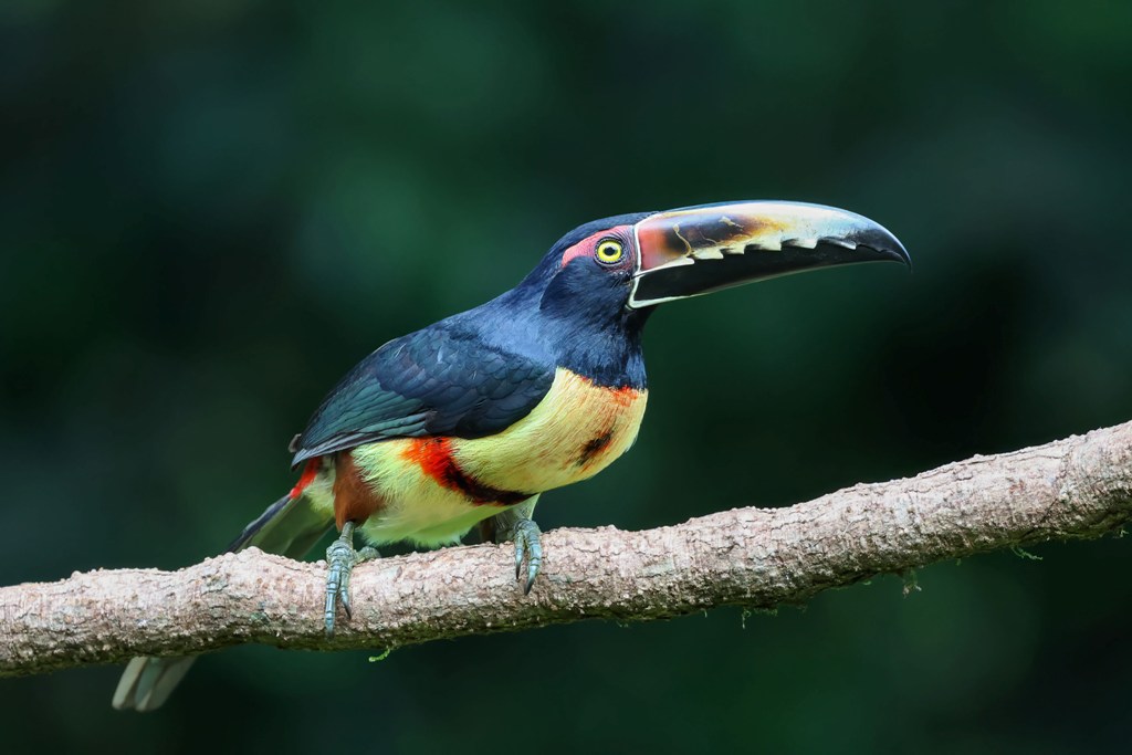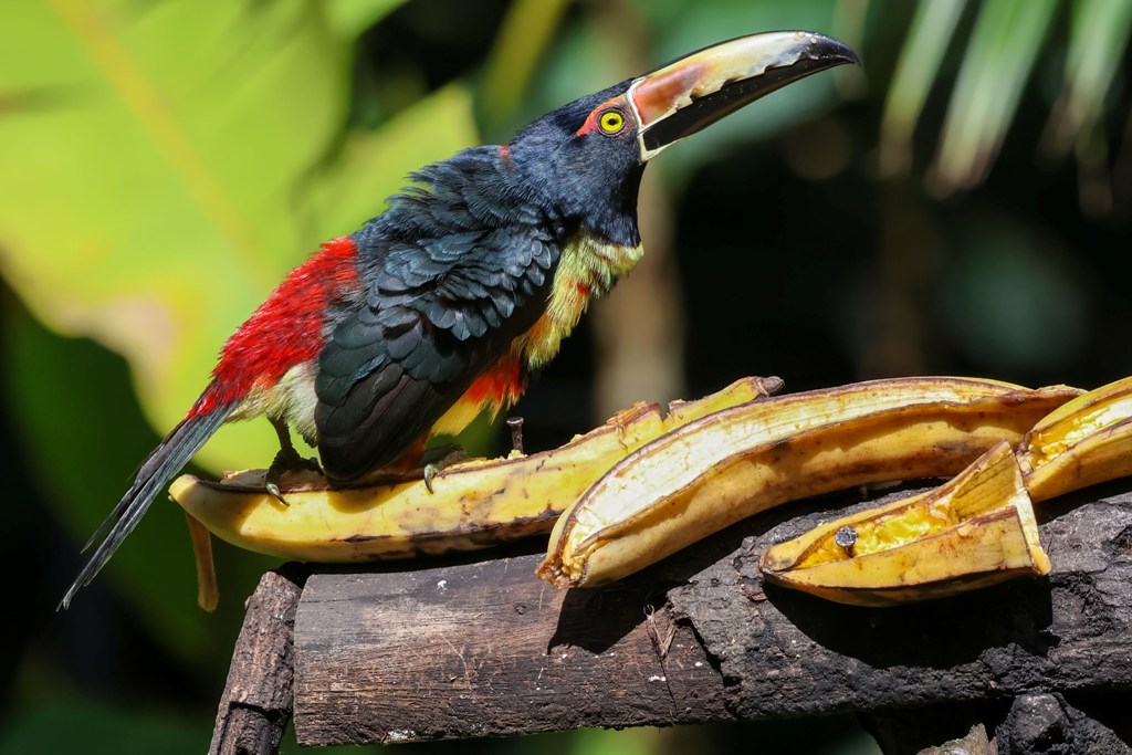…then they ruffle their feathers and get a bit possessive over their plantains! In the picture above he was (unsuccessfully) warning off a Keel-billed Toucan, who flew in and unapologetically commandeered the coveted spot at the feeding station!