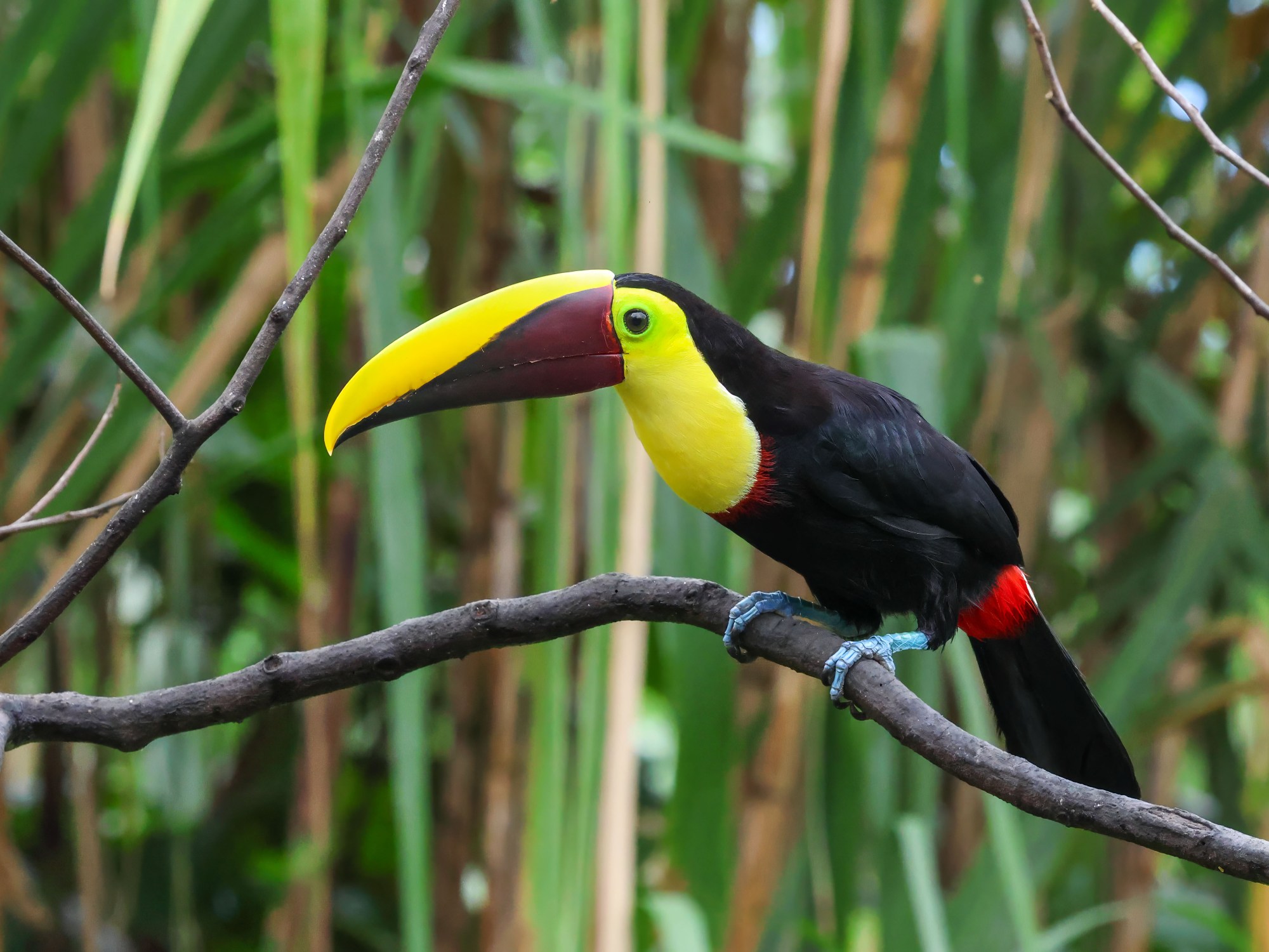 Let’s start with this Keel-billed Toucan, which is sometimes called a Rainbow-billed Toucan because of his colorful bill. When he showed up, he flew down and landed on the plantains…