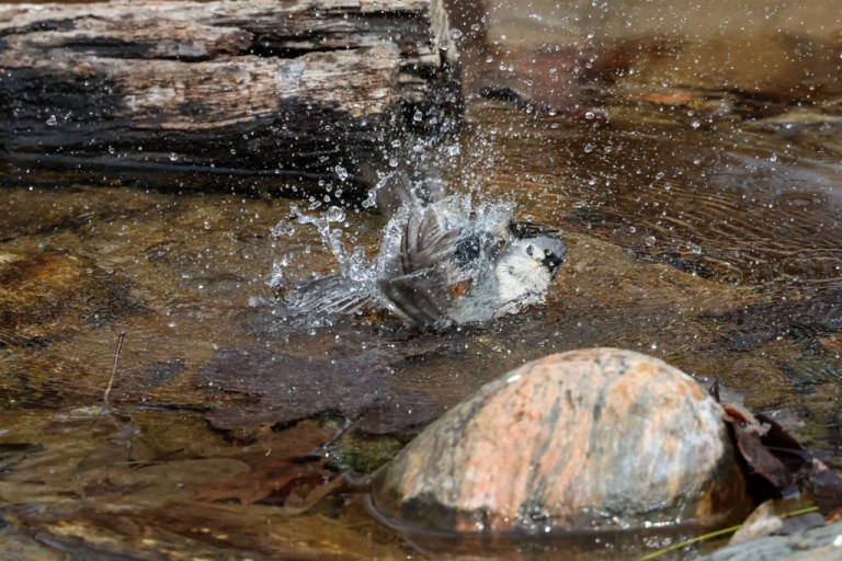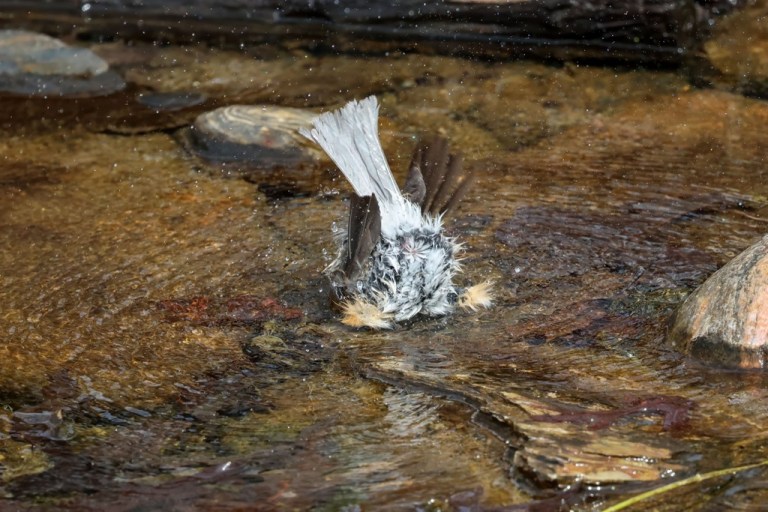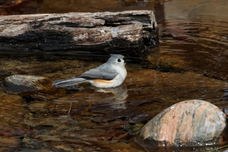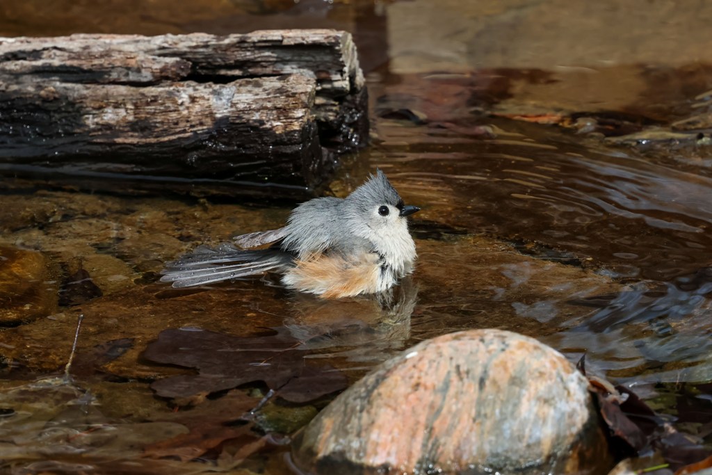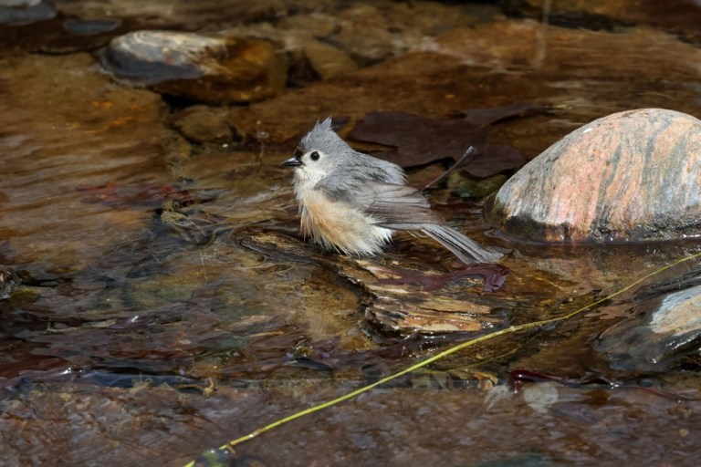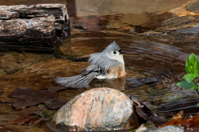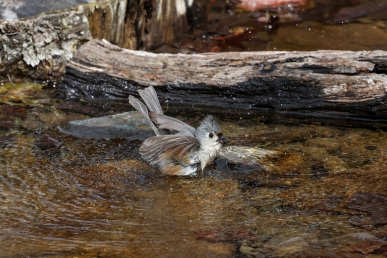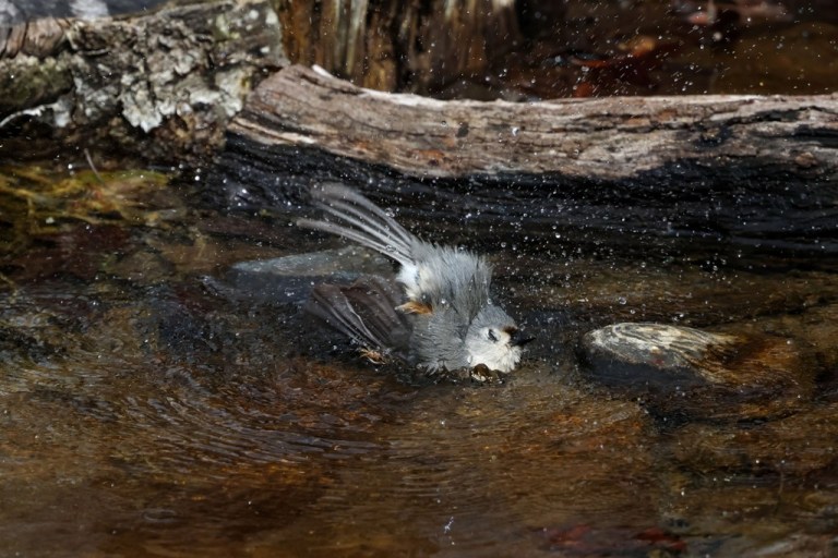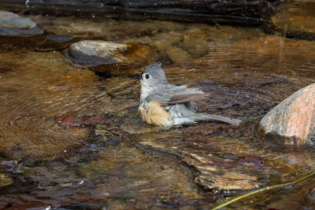 A pair of Tufted Titmice, who apparently decided to get a head start on their spring cleaning, hopped in the fountain the other day and gave their feathers a thorough soaking!