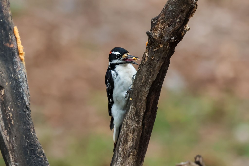 A handsome Hairy Woodpecker has been hanging about in the backyard lately, only he is a wee bit antsy! Whenever I am outside with my camera, he tries to hide and keep his distance.