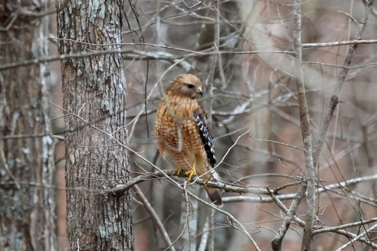 But he wasn’t the only hungry hider hanging about. Before long, all the birds rapidly scattered and I turned to see a Red-shouldered Hawk semi-concealed amidst a tangle of twigs and branches. I tried (I really tried!) to get a clear shot, but despite my twisting and stooping and leaning and bending, the best I could do was just get evidence of his presence!