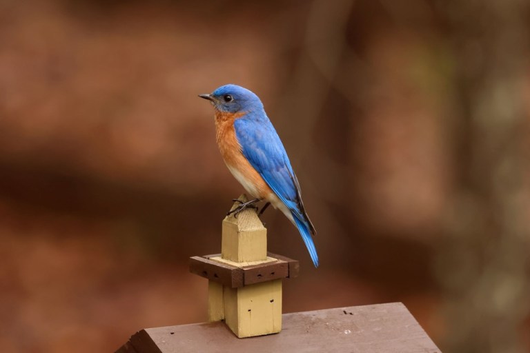 A stunning male Bluebird, who is occupying a nearby birdhouse with his mate, perched for a bit…