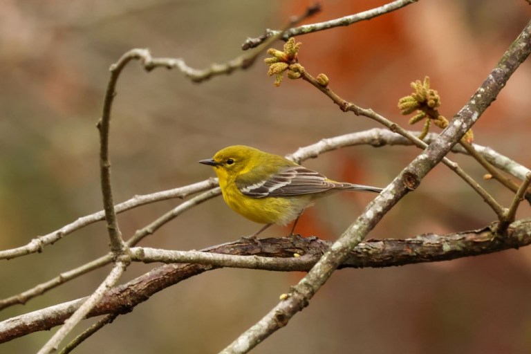 …and a pretty Pine Warbler landed on a branch, with signs of spring appearing around him.