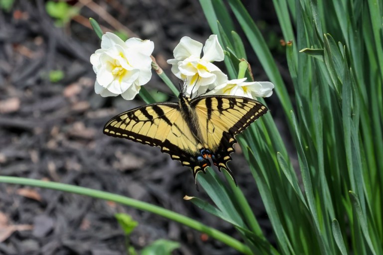 Butterfly season doesn’t hit full force til mid to late summer around here, but this lovely lady showed up at the start of spring, investigating a trio of blossoms.