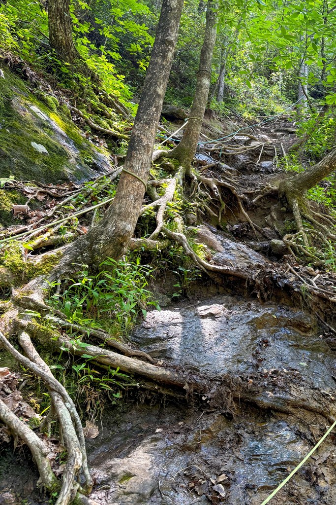 …but the highlight of the hike is the third falls, which are about a 50 foot drop. The only thing is, to get to the base of the falls you need to descend a steep path of rocks, roots, and mud, which (especially after all the rain we’ve had lately) is super slick. The good news is that previous hikers had left lots of rope to help navigate the challenge, but still, I’d be lying if I said my rear end didn’t come away muddy! Here’s a view of the slippery slope…