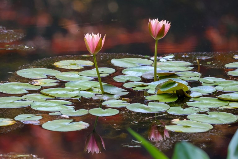 I really like the picture of the lilies below because of the way the reflection of some red Japanese maples was giving the water a rosy tint.
